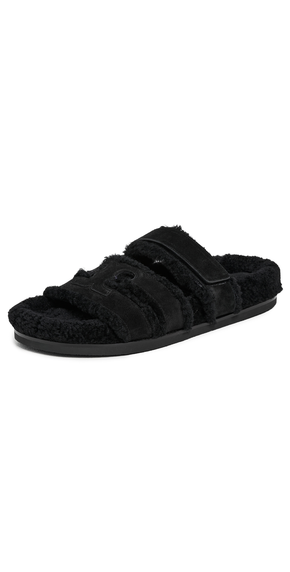Dyed shearling (lamb) from France. Upper: Suede. Velcro strap. Lining: Shearling. Slip on. Open toe. Rubber sole. Imported, Indonesia. This item cannot be gift-boxed.