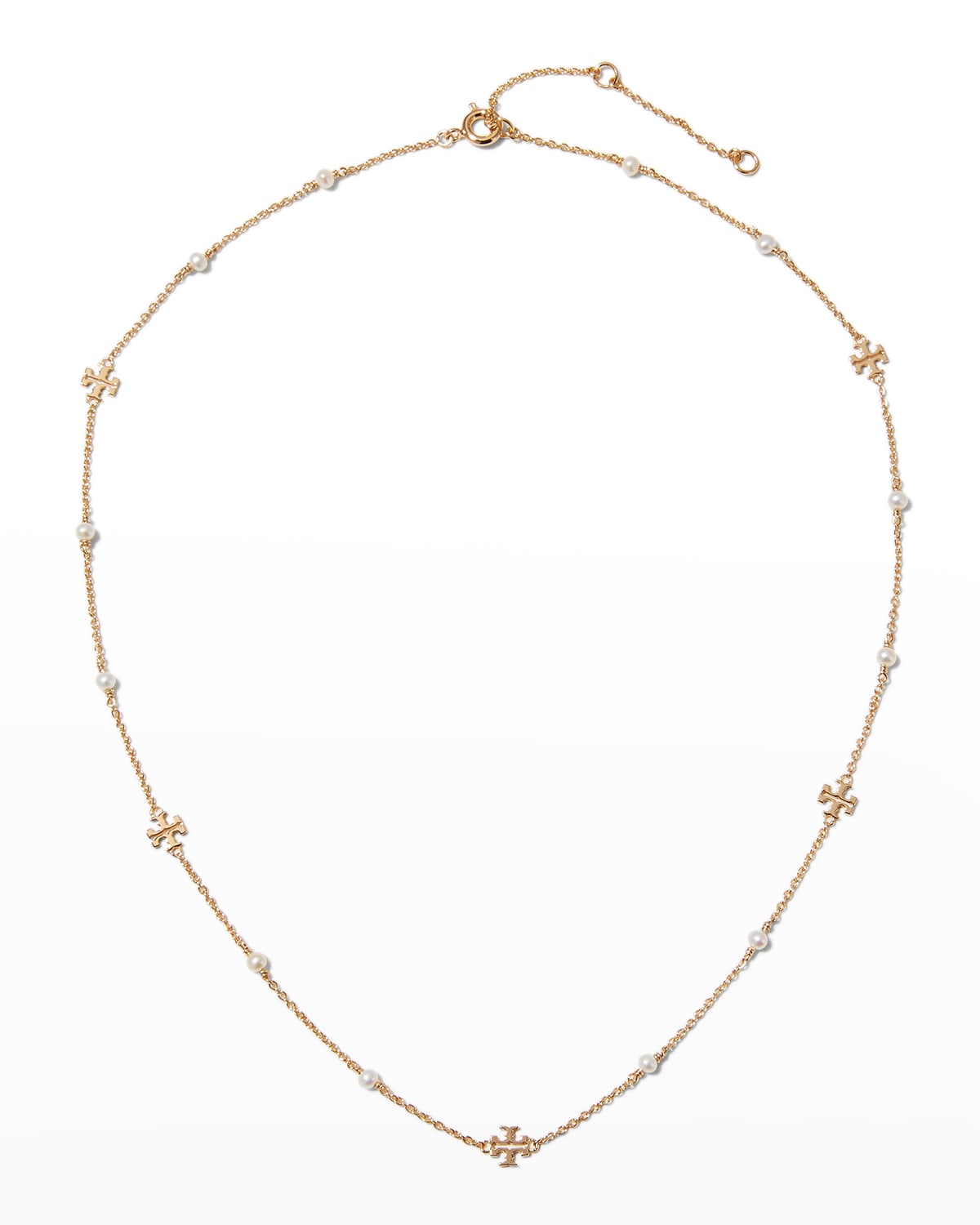Tory Burch necklace Approx. 16 inches Goldtone brass Signature doubleT logo Naturally white freshwater cultured pearls Adjustable length Springring clasp Imported