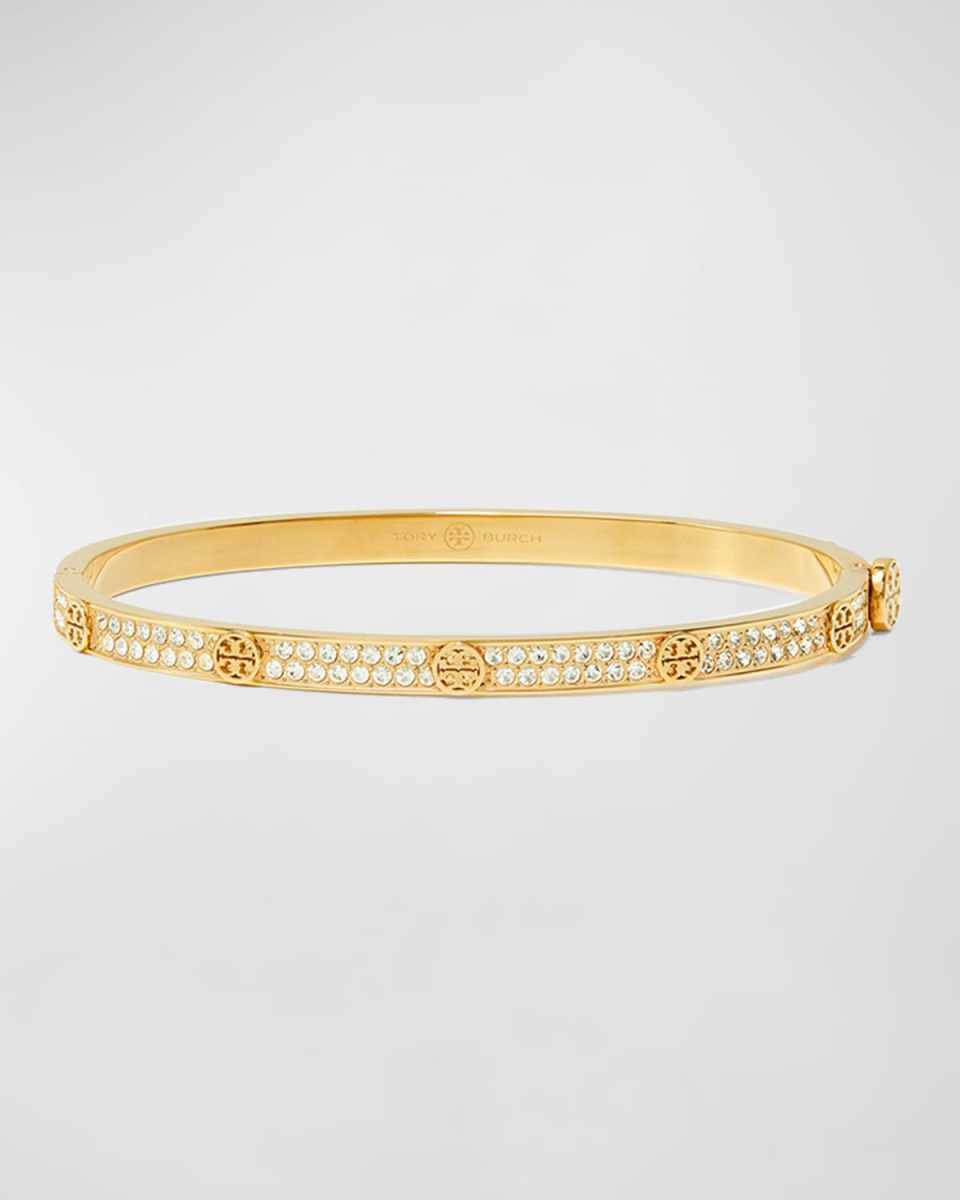Tory Burch "Miller" bracelet with Double T studs and pavé crystals Approx. 5mm wide (0.2 inches) Silvertone or golden brass Hinge closure Imported