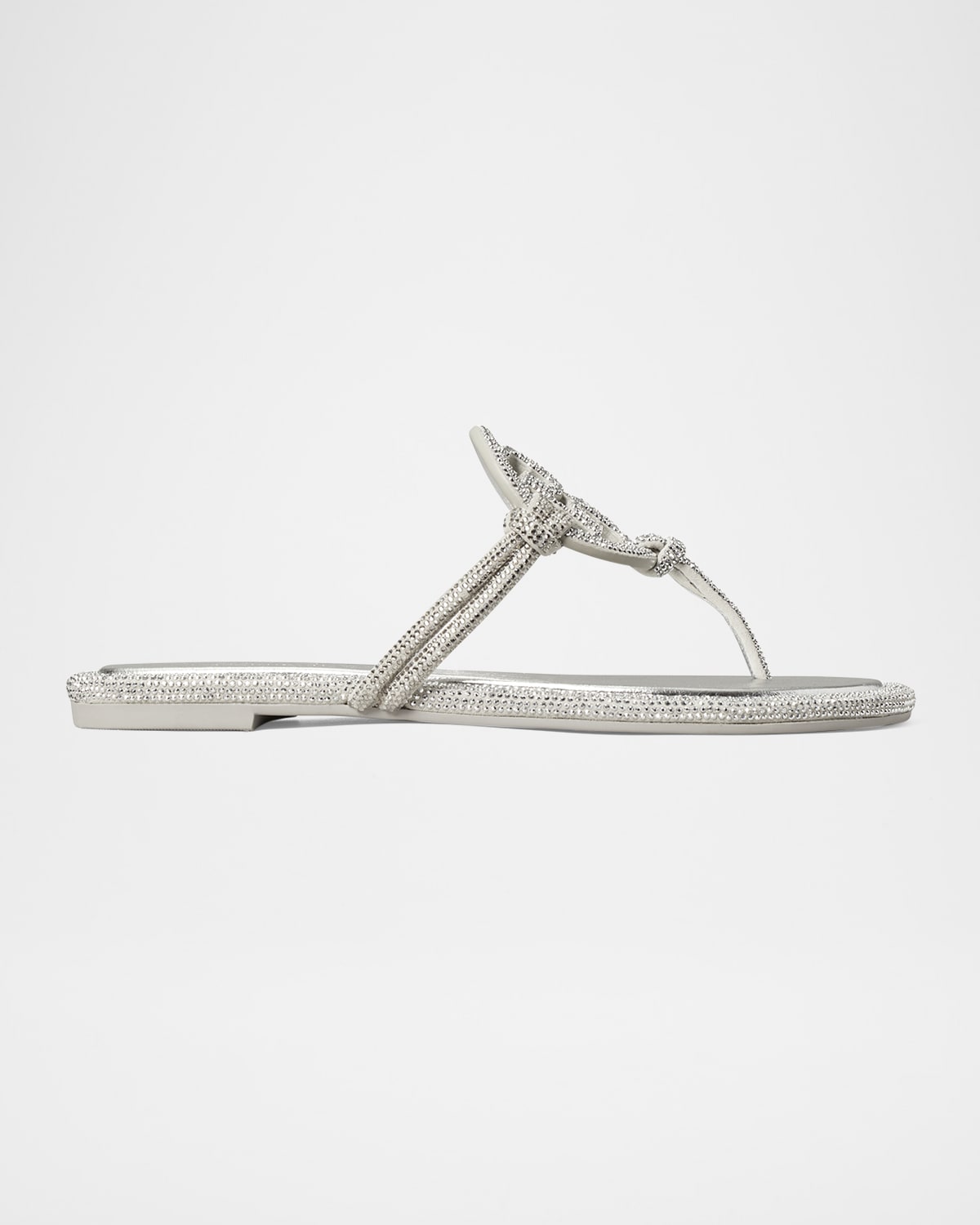 Tory Burch "Miller" metallic leather sandals with pavé embellishment Flat heel Thong strap DoubleT logo vamp Rubber outsole Lining: Leather Spot clean Imported