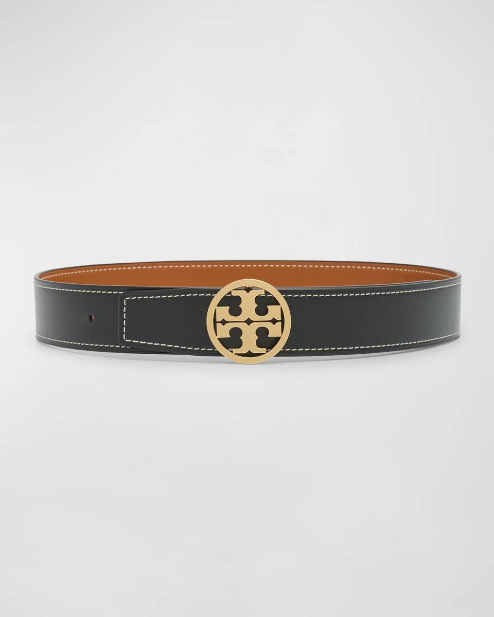 Tory Burch "Miller" reversible belt in smooth leather and golden hardware Adjustable fit Monogram buckle Contrast stitching Imported