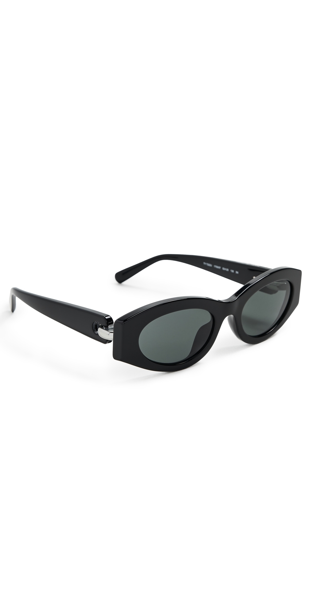Silver-tone ring accents. Soft case included. Oval frame. Non-polarized lenses. Imported, China. Acetate frame. Plastic lenses. Measurements: Width: 5.5in / 14cm Height: 1.75in / 4.5cm Lens Width: 52mm Bridge: 20mm Arms: 135mm