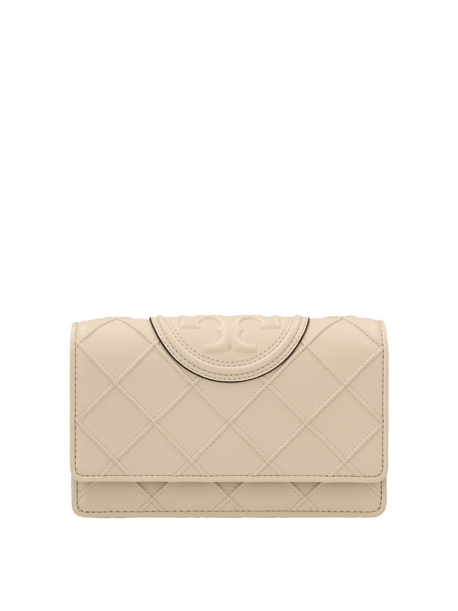 Portefeuille avec bandoulière en chaîne et logo estampé.
