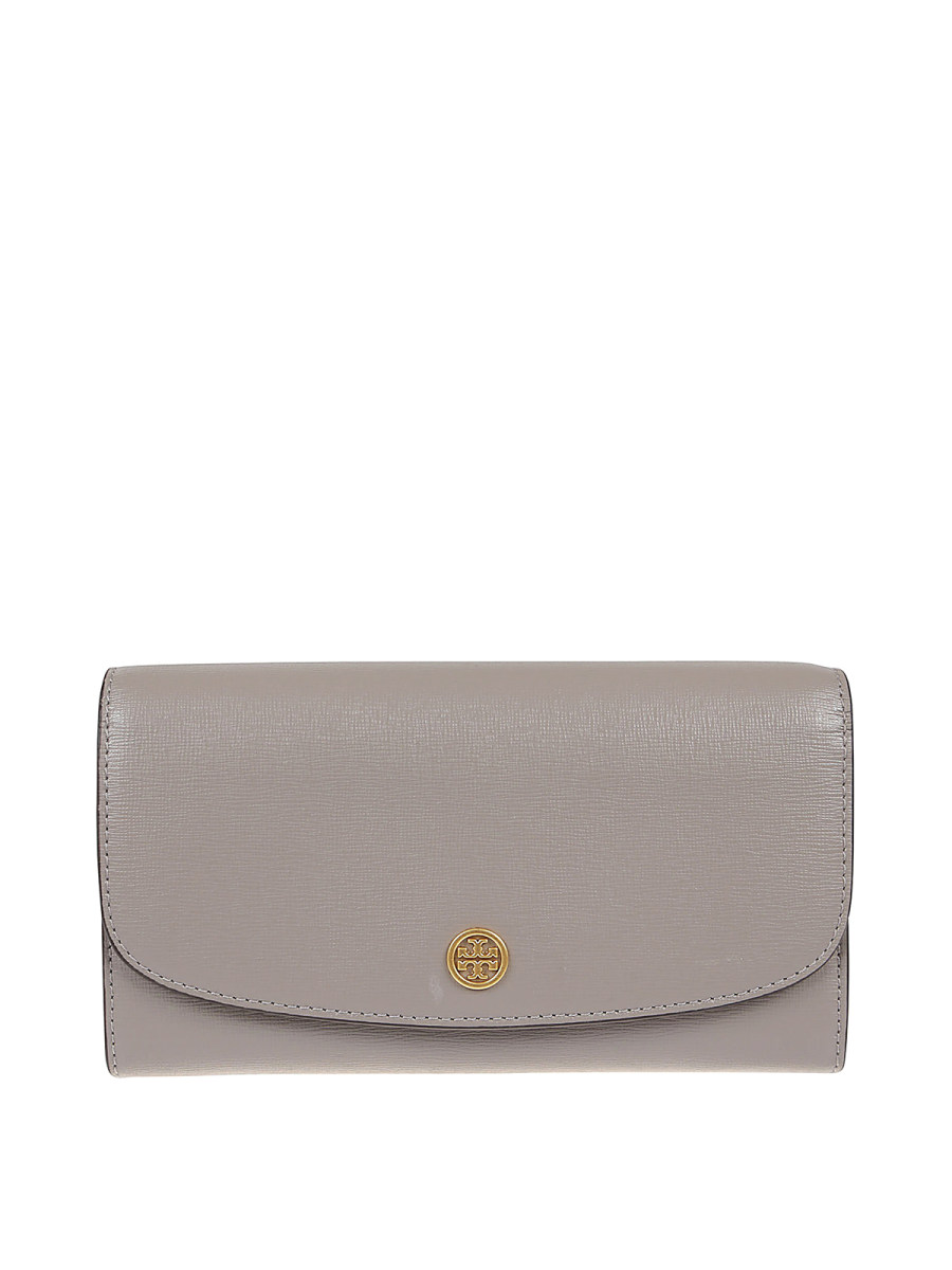 Portefeuille à bandoulière en cuir Saffiano doté d'une bandoulière chaîne dorée amovible, de deux compartiments ouverts et d'un compartiment zippé, de fentes intérieures pour cartes et d'une fermeture à rabat.