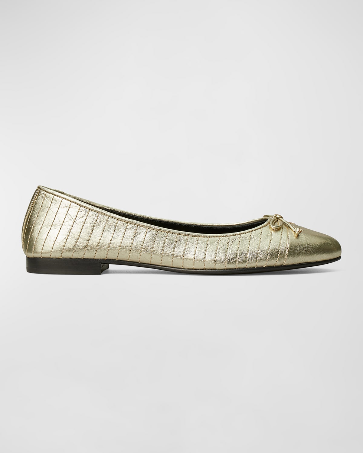 Tory Burch quilted metallic leather ballerina flats with bow and mini logo medallion accent Flat heel Round cap toe Slipon style Leather/Rubber outsole Lining: Leather/goat leather Imported