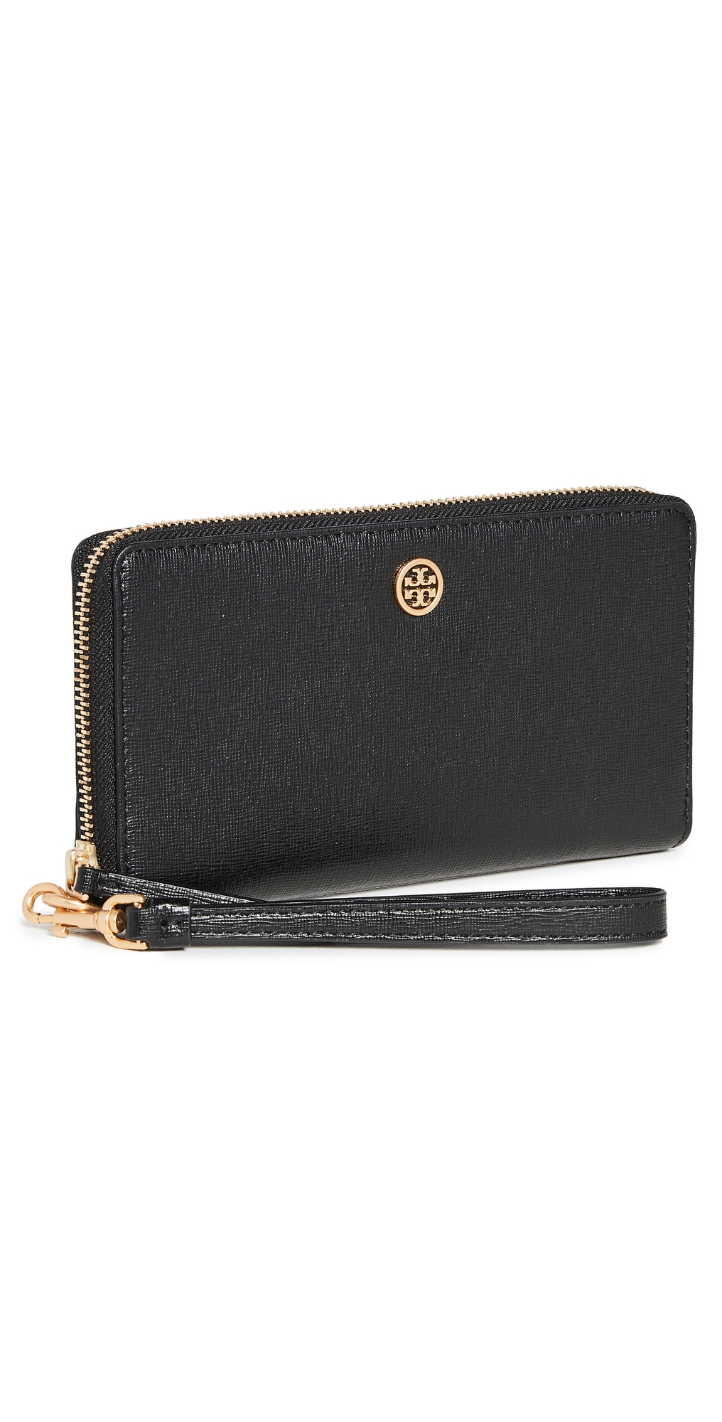 Leather: Saffiano cowhide. Gold-tone brand emblem. Optional wristlet. Exposed zip at top. Zip interior pocket. Card slots at interior. Lined. Weight: 8oz / 0.23kg. Imported, China. Measurements: Height: 4in / 10cm Length: 7.75in / 20cm Depth: 0.75in / 2cm