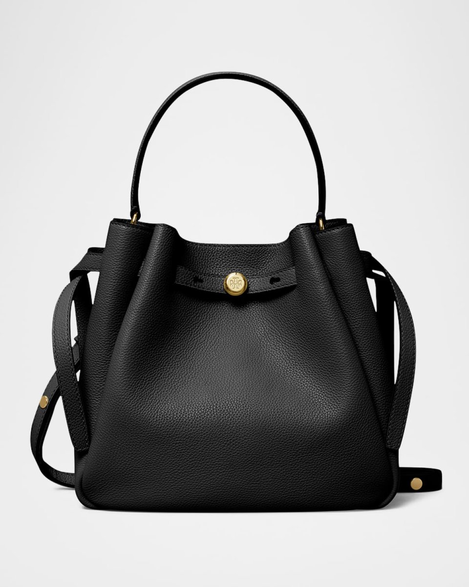 Tory Burch "Romy" bucket bag in pebbled calf leather Top handle Detachable, adjustable crossbody strap Can be worn as a top handle or shoulder/crossbody bag Open top with magnetic closure Exterior, adjustable belted strap with stud closure Interior, one slip pocket Lining: Polyurethane Approx. 8.6"H x 8.7"W x 3.7"D Spot clean Imported