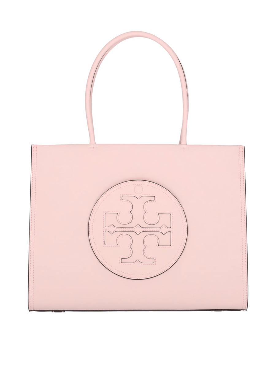Petit sac fourre-tout Ella Bio Tory Burch en bio-tex biofabbrica rose, deux poignées supérieures rigides réglables et amovibles, une poche avec bouton caché sur le devant, écusson à double logo en T ton sur ton appliqué aimanté, un compartiment principal, une poche plate intérieure, une poche intérieure zippée