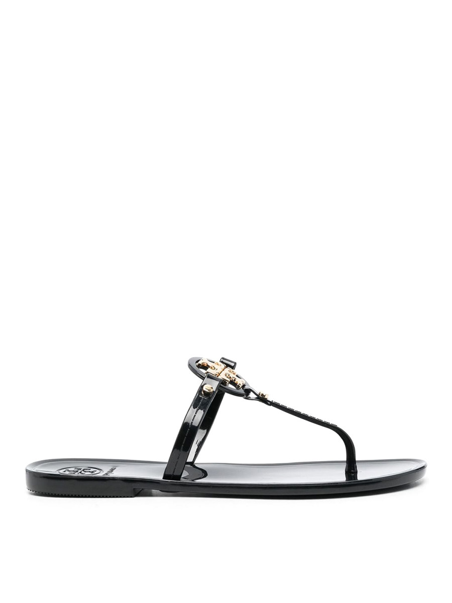 Plaque logo Mini Miller Sliders noire dorée, clous dorés, lanière, bout rond et semelle plate en caoutchouc.
