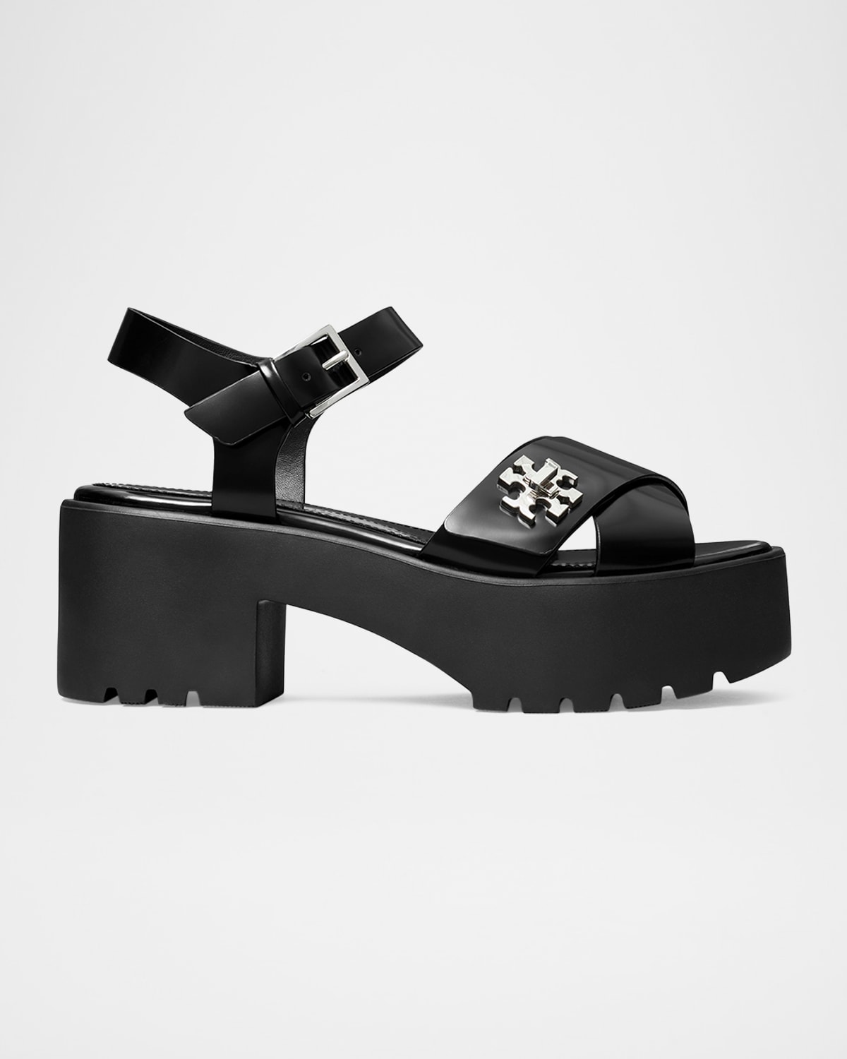 Tory Burch platform sandals in calf leather with silvertone Double T hardware 2.00 in / 50 mm block heel Open toe Crisscross vamp Buckle ankle strap Lightweight, flexible EVA outsole Lining: Leather Spot clean Imported