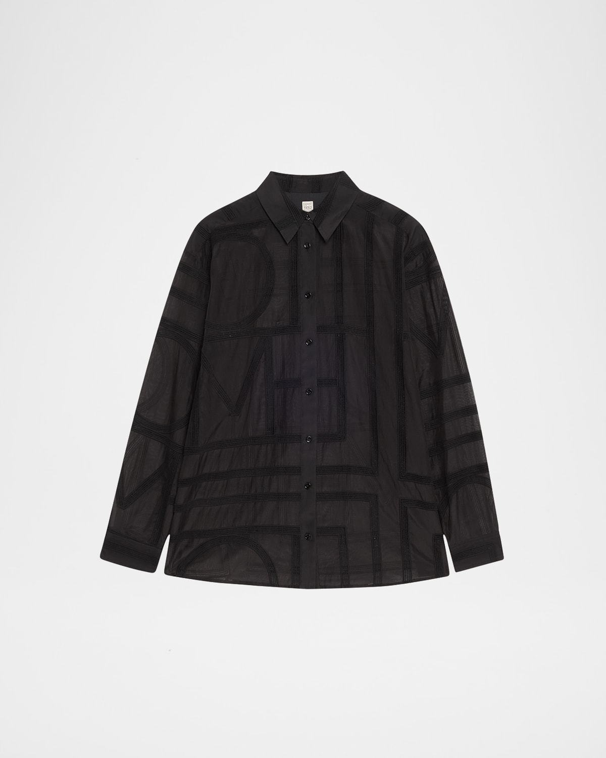 Toteme classic coton voile shirt animated with a crochetinspired embroidery of the toteme monogram Point collar; button front Long sleeves; button cuffs Drop shoulders Yoked back; box pleat Oversized fit Organic cotton/silk Dry clean Imported