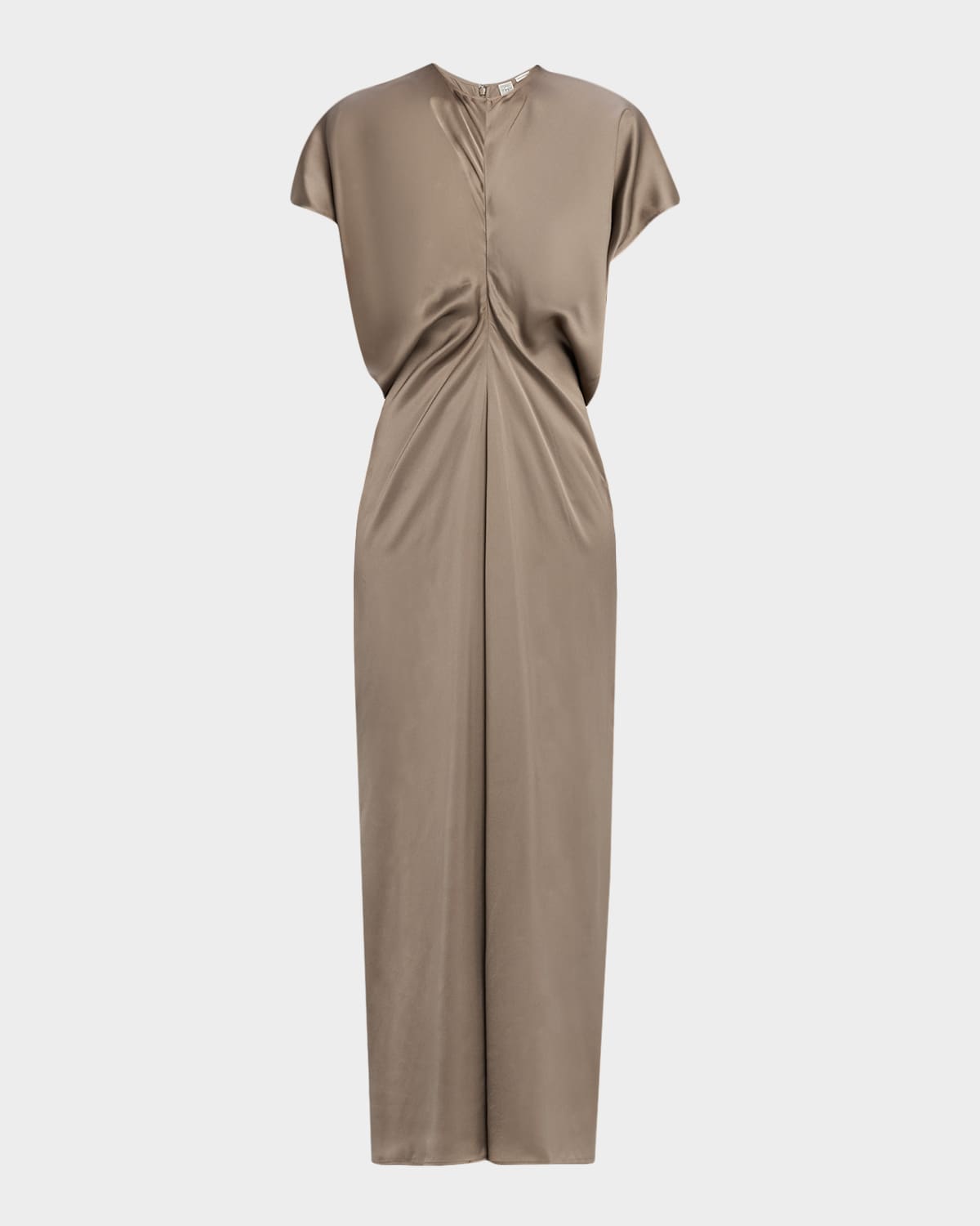Toteme fluid satin dress constructed from curved panels that create a slouching effect at the waist when sewn together Round neckline Short sleeves Full length Aline silhouette Back zipper Viscose Hand wash Imported