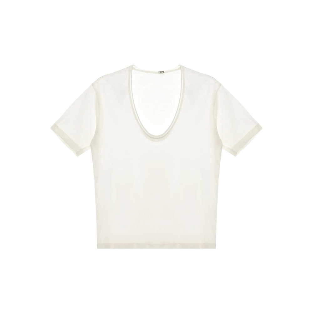 white cotton-silk blend short sleeves scoop neck straight hemline