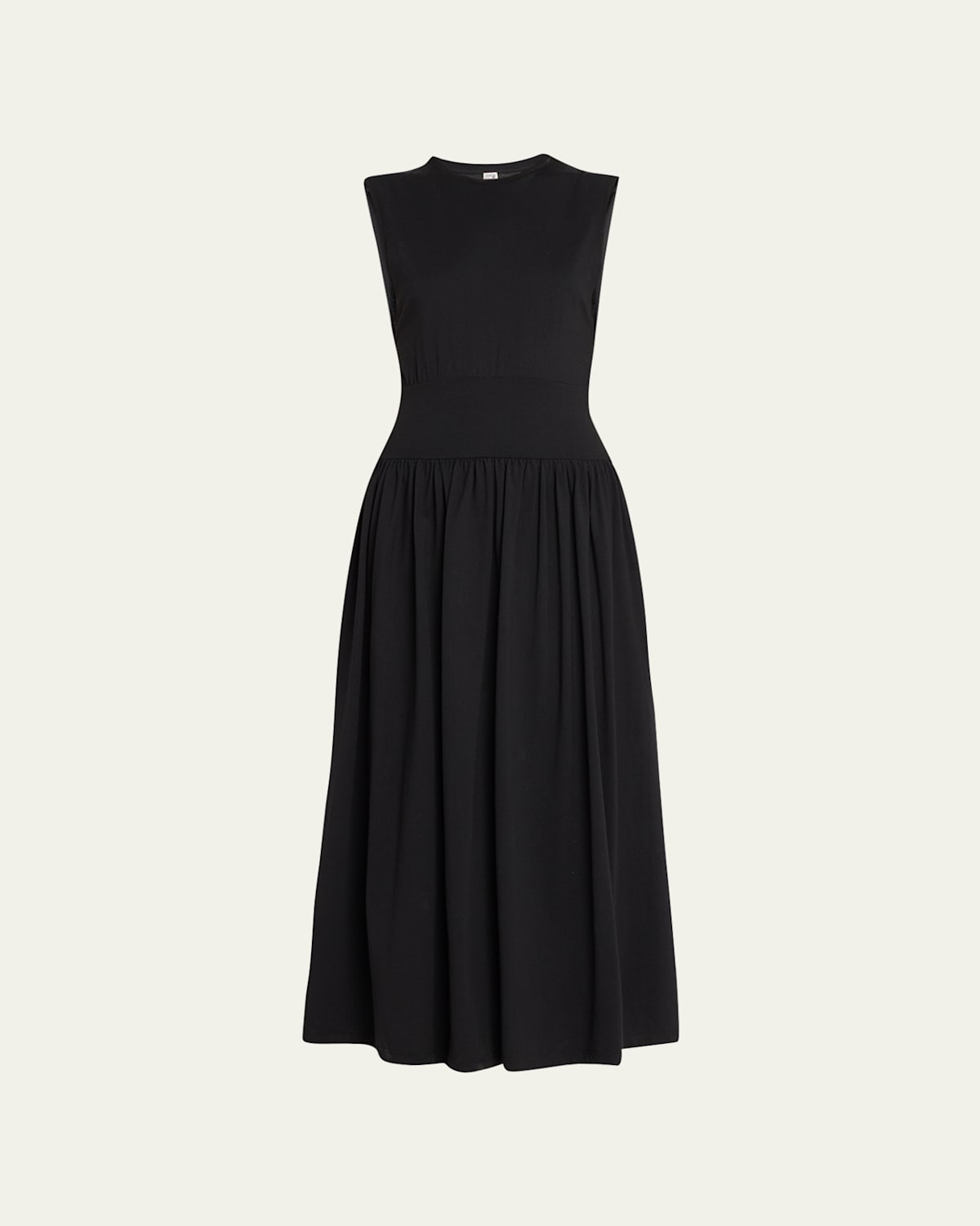 Toteme cotton midi dress featuring a defined waist finishes with pleating Crew neckline Sleeveless Side seam pockets Aline silhouette Hem falls below the knee Slipover style Organic cotton Dry clean Imported