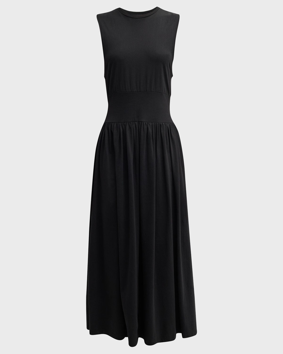 Toteme cotton midi dress featuring a defined waist finishes with pleating Crew neckline Sleeveless Side seam pockets Aline silhouette Hem falls below the knee Slipover style Organic cotton Dry clean Imported