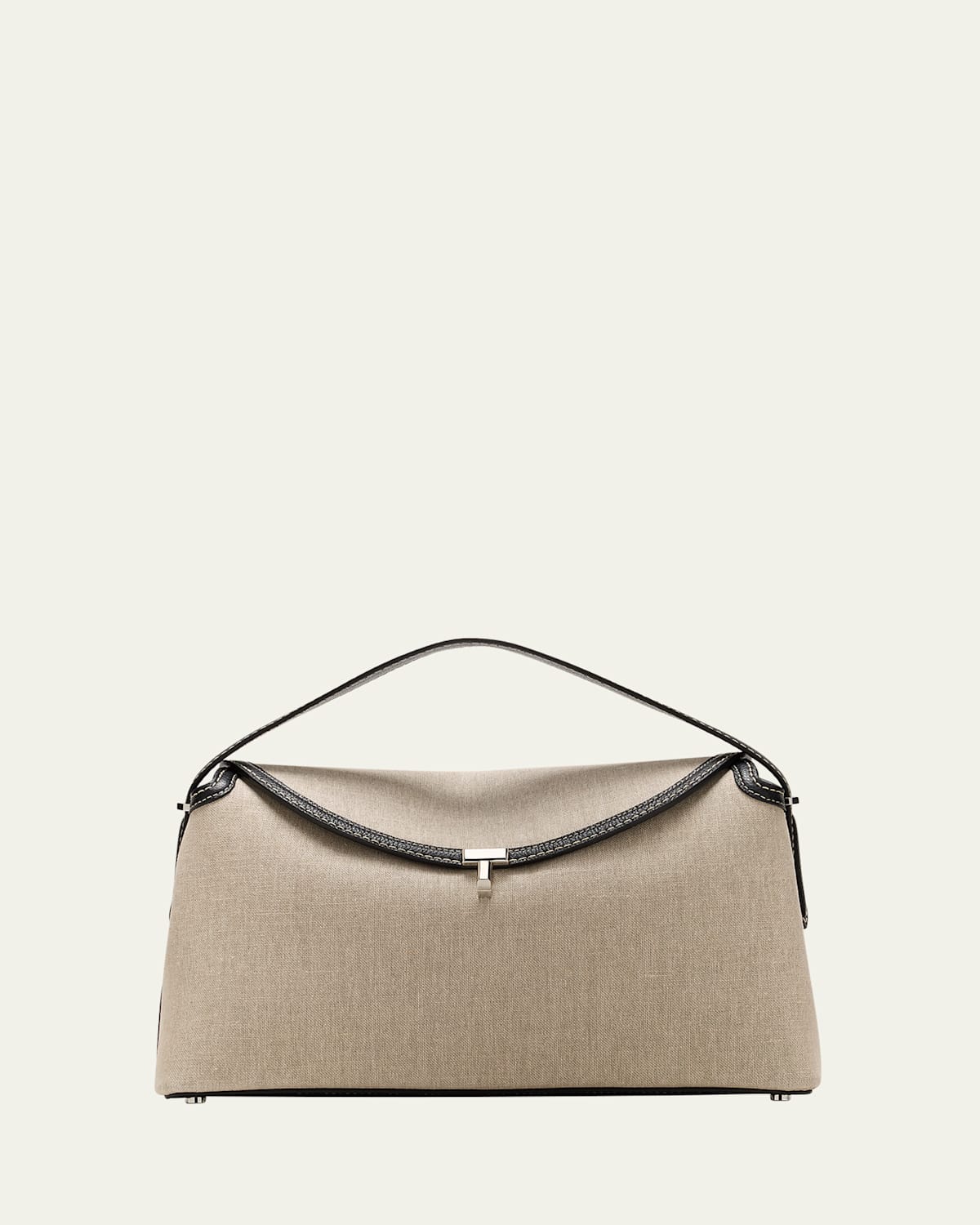 Toteme top handle bag in organic cotton and linen Top handle Detachable crossbody strap, 17.8" drop Can be worn as a top handle or crossbody bag Foldover flap top with Tlock closure Interior, two slip pockets Feet protect bottom of bag Approx. 6.7"H x 13.7"W x 4.5"D Made in Italy