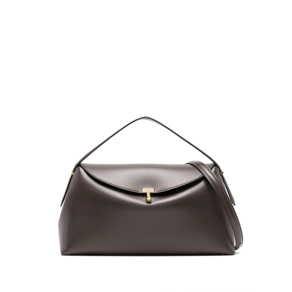 coffee brown calf leather smooth grain T-lock fastening single top handle adjustable detachable shoulder strap main compartment multiple internal slip pockets suede lining metal feet