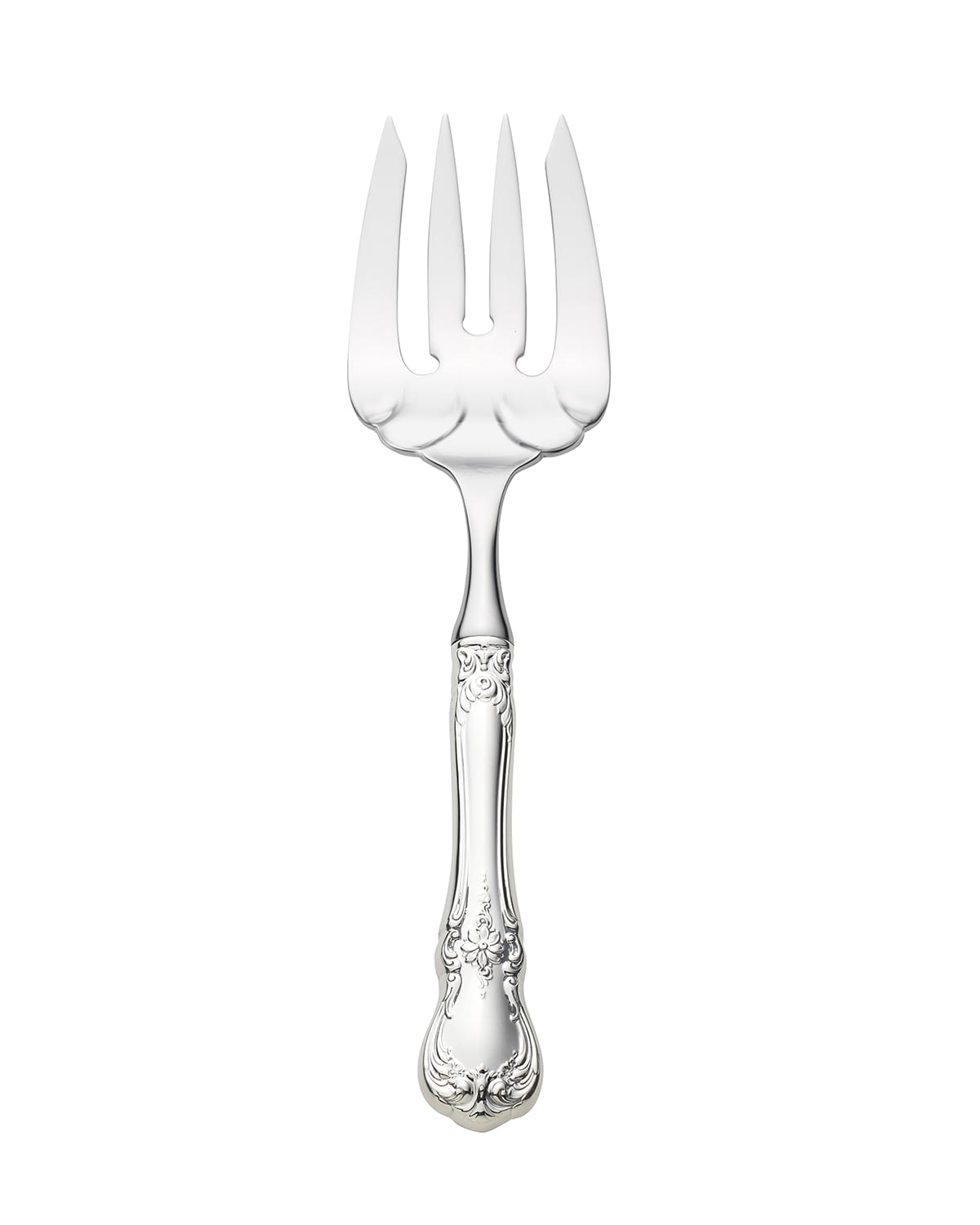 Large serving fork made of sterling silver. Stainless steel blade. Hollow handle. Dishwasher safe, remove before drying cycle. Made in the USA.