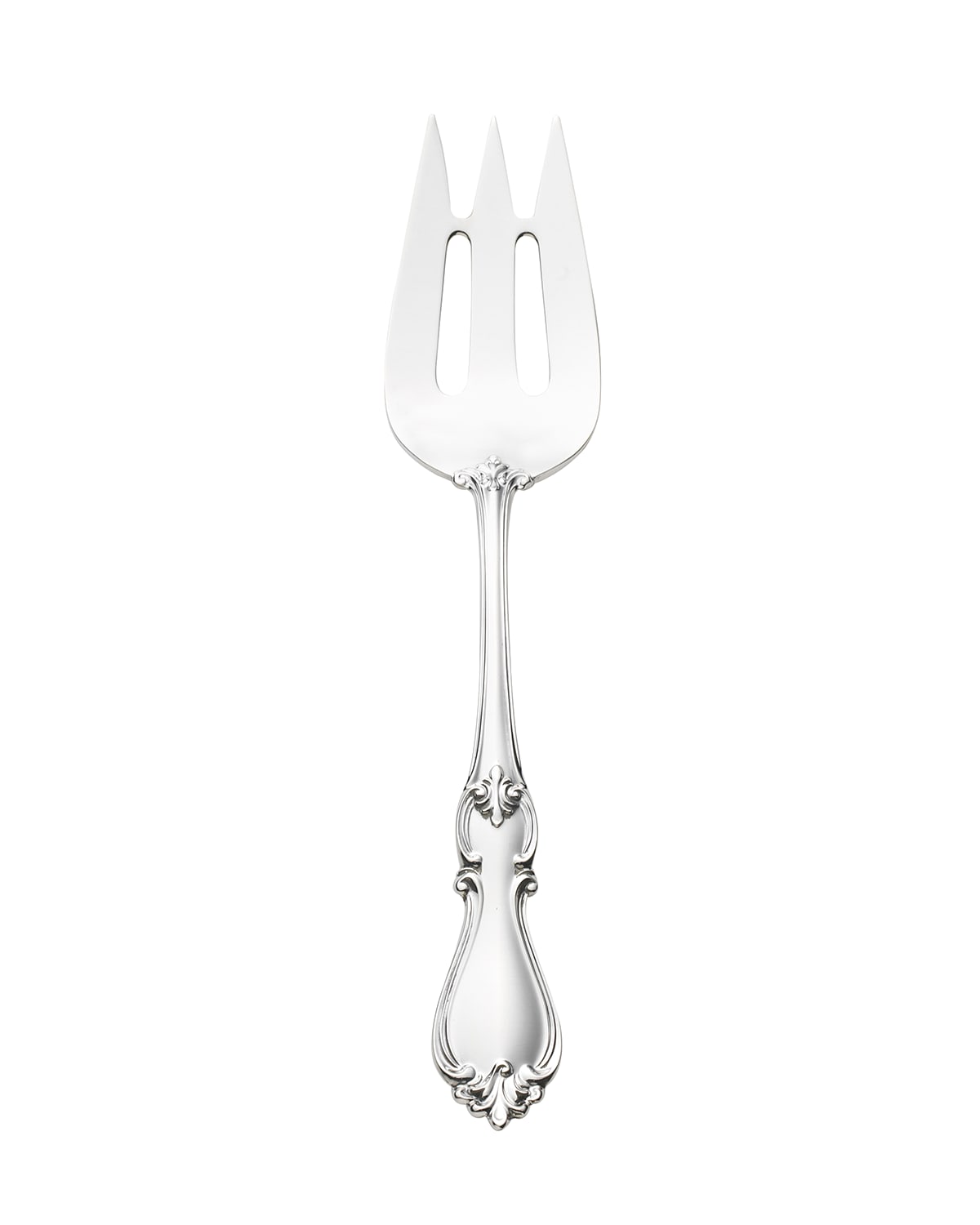 Cold meat fork made of sterling silver. Excellent for serving meats, poultry, and cold cuts. Dishwasher safe, remove before drying cycle. Made in the USA.