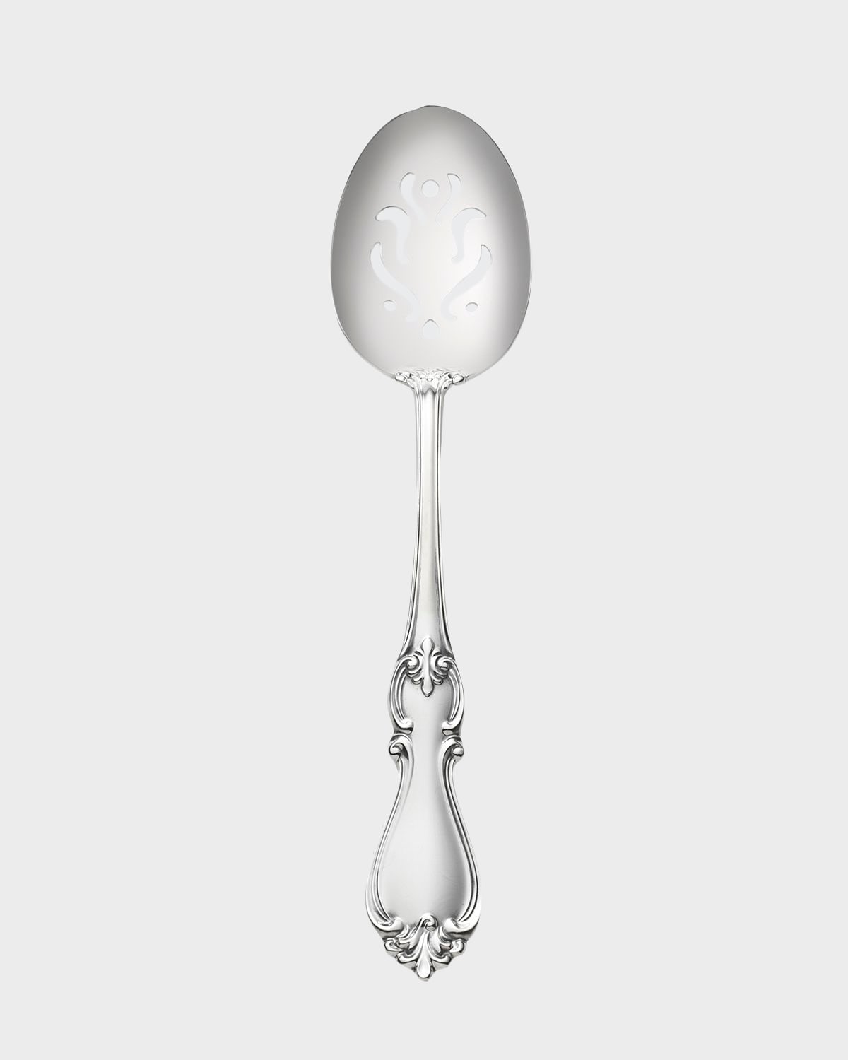 Pierced tablespoon made of sterling silver. Suitable for vegetables and fruits. Dishwasher safe, remove before drying cycle. Made in the USA.