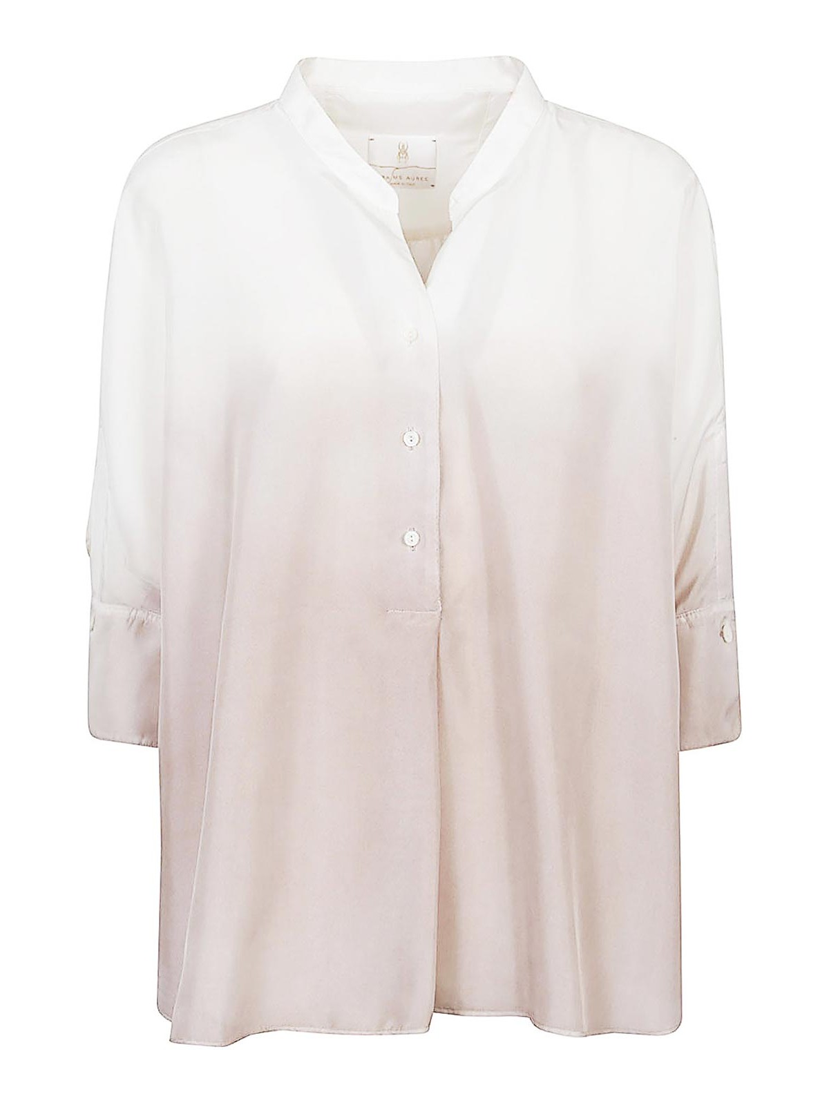 Chemise en soie blanche avec une teinte beige vers le bas, col mandarin, fermeture boutonnée sur le devant, épaules tombantes, manches 3/4 avec poignets boutonnés, ourlet asymétrique.