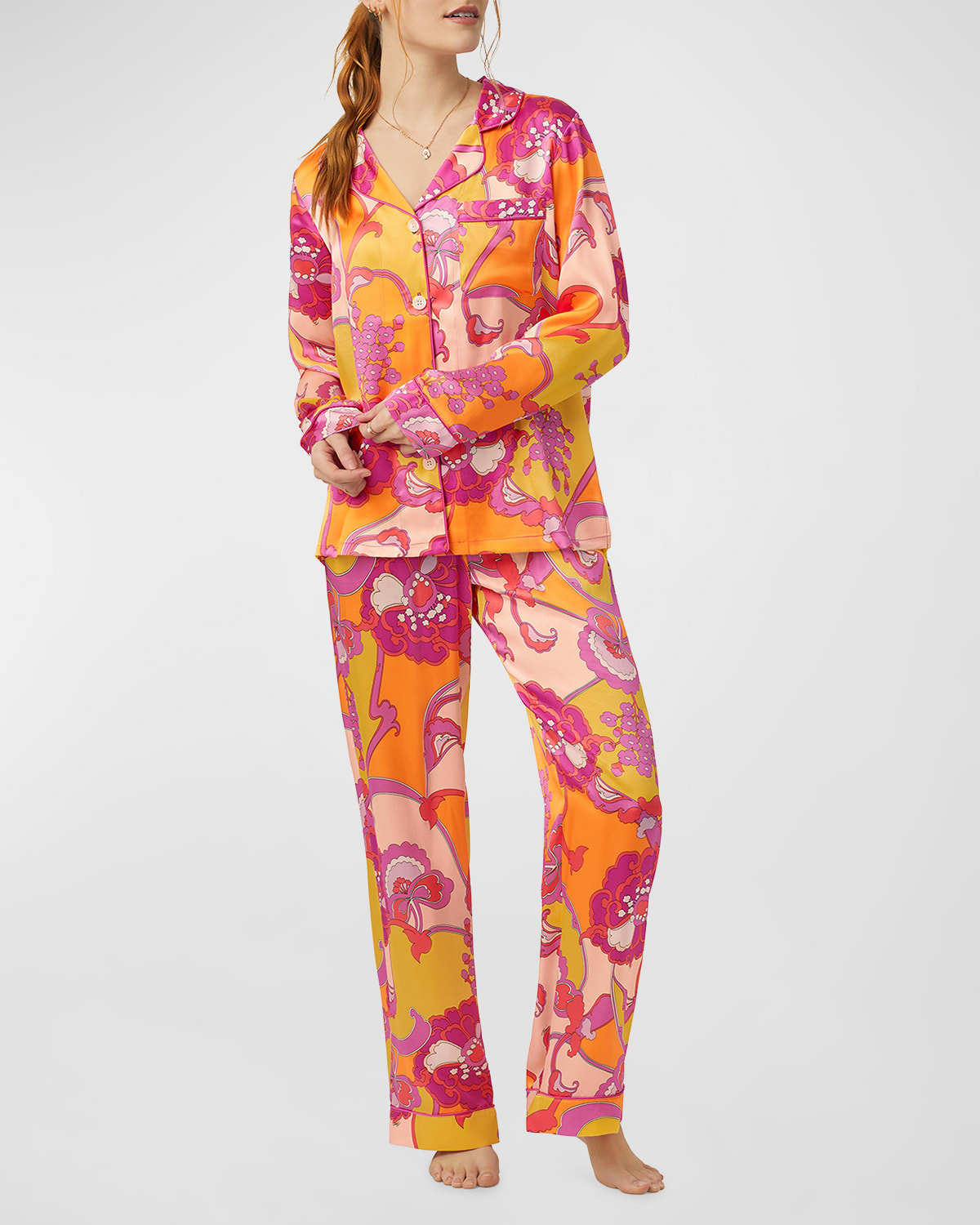 BedHead Pajamas floralprint pajama set in washable silk satin with contrast piping Approx. 27"L from shoulders to hem Notched collar; button front Long sleeves; approx. 24.5"L Chest patch pocket Relaxed fit Includes matching pants Approx. 31"L inseam Elasticized drawstring waistband Onseam pockets Full length Straight legs Pullon style Silk Machine wash cold Imported