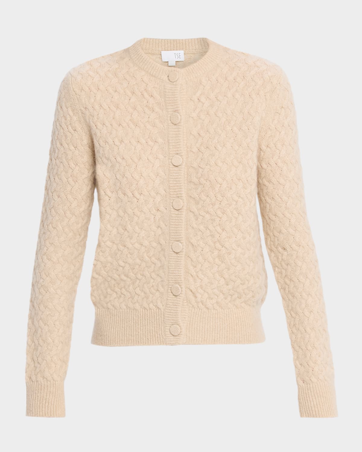 TSE Cashmere cardigan crafted in boucle cableknit cashmere, adding intricate texture to the classic silhouette Approx. 21"L from shoulders to hem 7GG, 1ply Crew neckline Button front Long sleeves; approx. 29"L Relaxed fit Cashmere Dry clean Imported