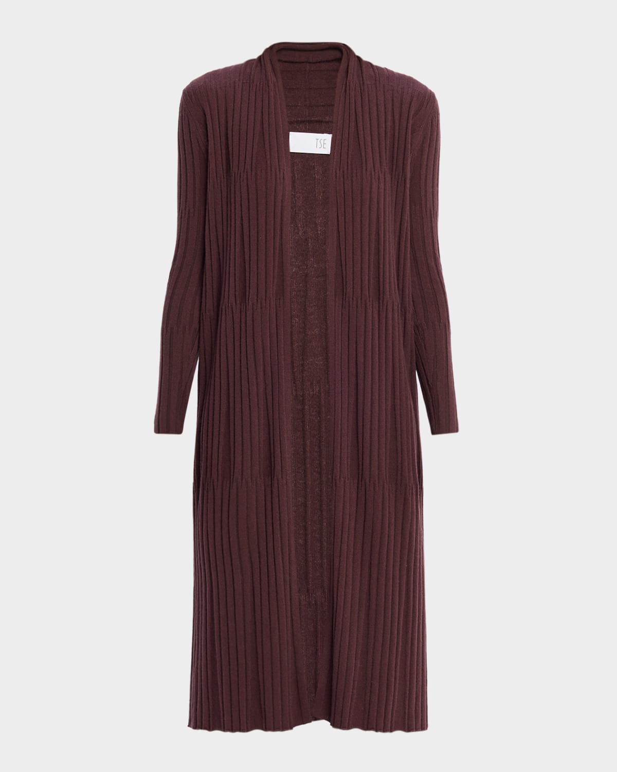 This TSE Cashmere cardigan exudes elevated simplicity, crafted in cashmere with variegated ribbing for dimensional texture Approx. 45"L from shoulders to hem 12GG, 2ply Open front Long sleeves; approx. 29.5"L Hem falls below the knee Straight silhouette Cashmere Dry clean Imported