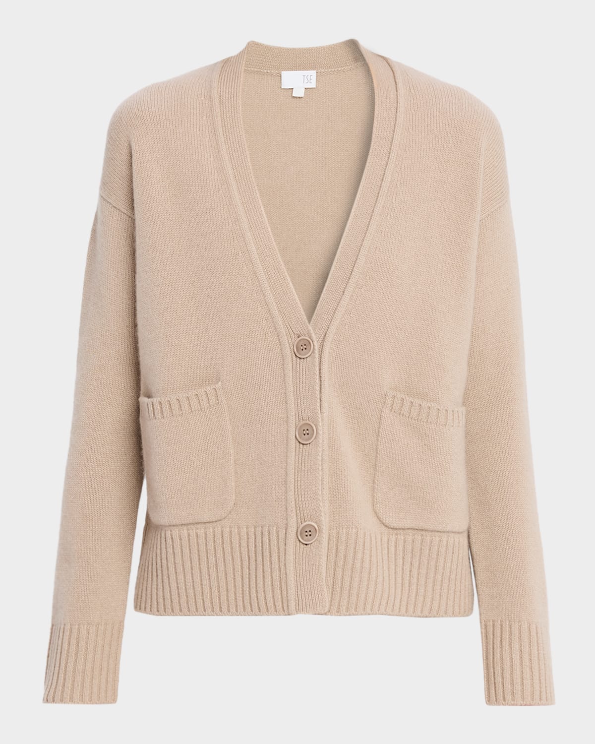 This heavy jerseyknit cardigan from TSE Cashmere features wide ribbed trim for added texture Approx. 24"L from shoulders to hem 5GG, 3ply Deep V neckline Button front Drop shoulders Long sleeves; approx. 30.5"L Front patch pockets Relaxed fit Cashmere Dry clean Imported