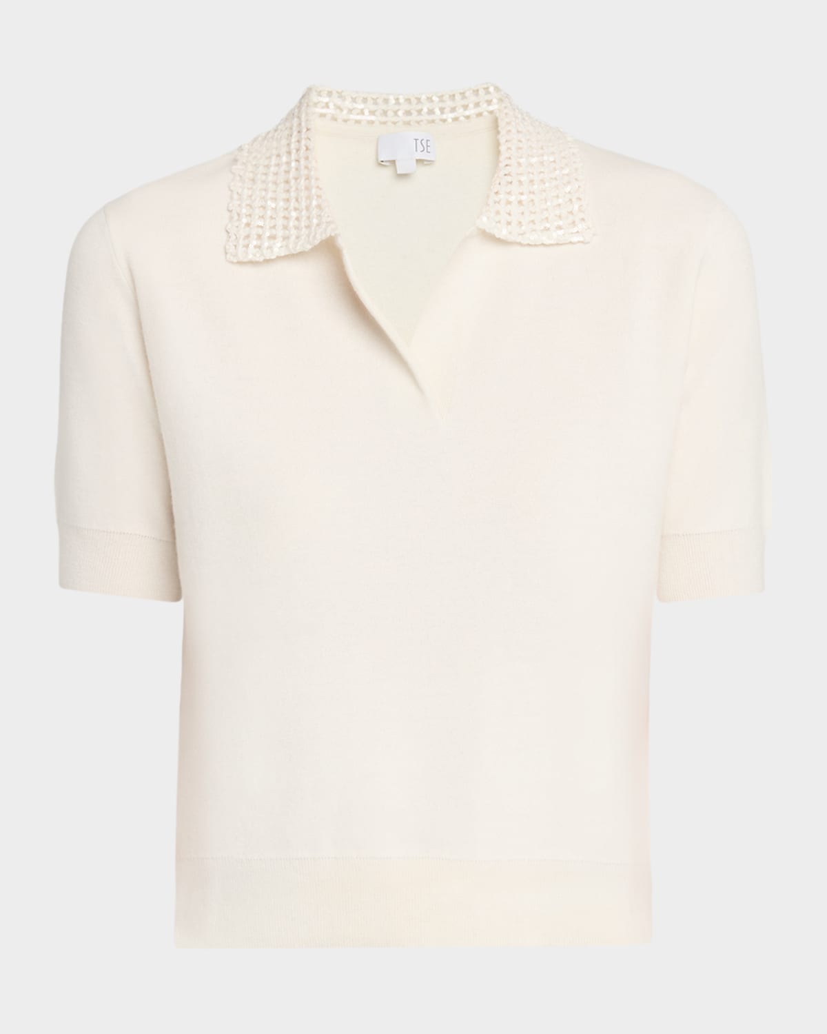 The classic polo shape meets fun glam in this TSE Cashmere top, the sophisticated and minimalistic silhouette accented by the sequin net collar Approx. 20"L from shoulders to hem 16GG, 2ply Polo collar Short sleeves; approx. 16"L Relaxed fit Pullover style Cashmere/polyester Trim: Beaded Dry clean Imported