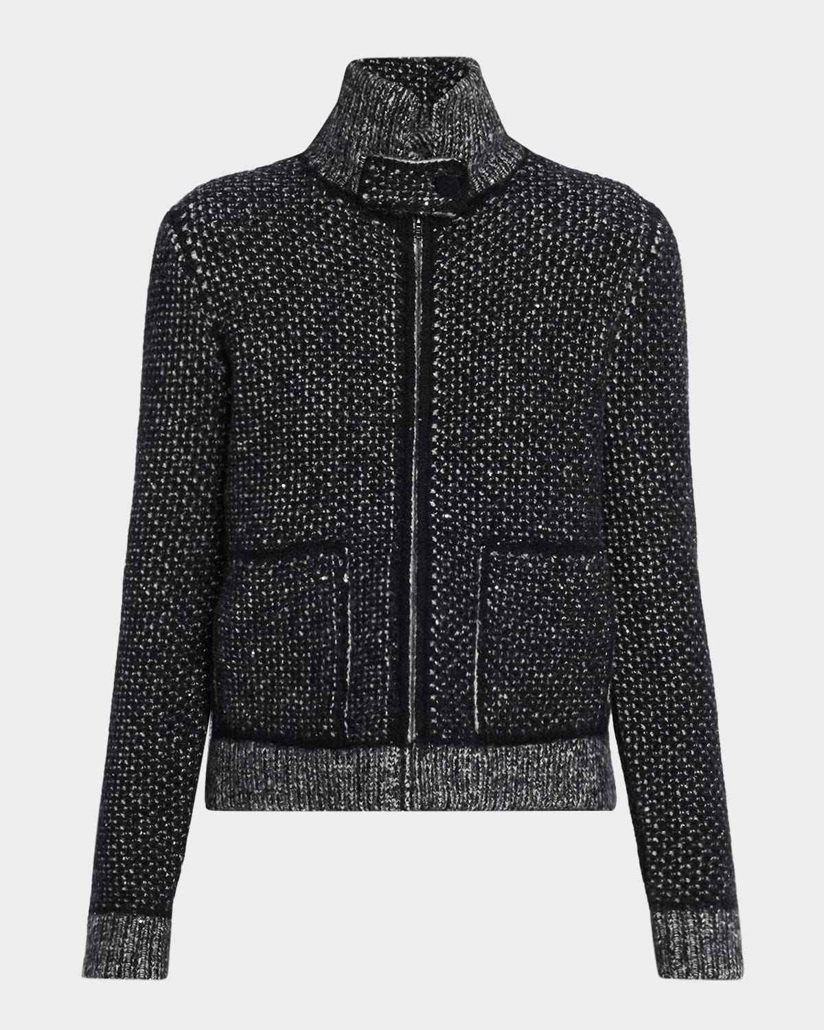 TSE Cashmere mottled knit jacket detailed with contrast ribbing and sequins for a subtle shimmer Approx. 21"L from shoulders to hem 5GG, 2ply, sequin, spandex Stand collar; button/zip front Long sleeves; approx. 30"L Ribbed cuffs and hem Front patch pockets Relaxed fit Cashmere/cotton/polyester Dry clean Imported