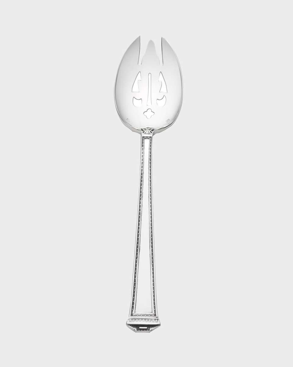 Pierced tablespoon made of sterling silver. Stainless steel blade. Made in the USA.
