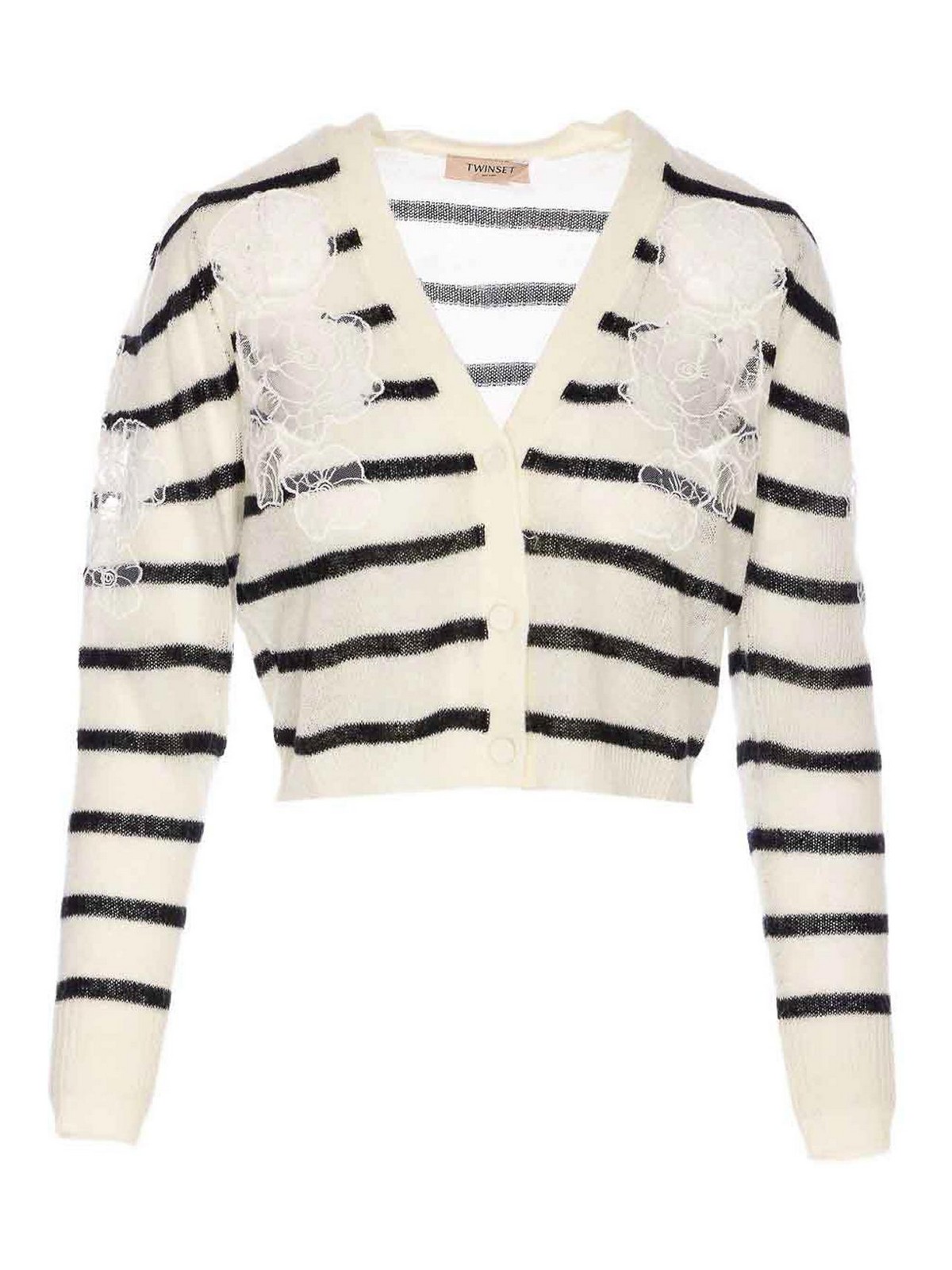 Cardigan de sol orné de lignes blanches et noires, encolure en V, décoration florale, manches longues avec boutons