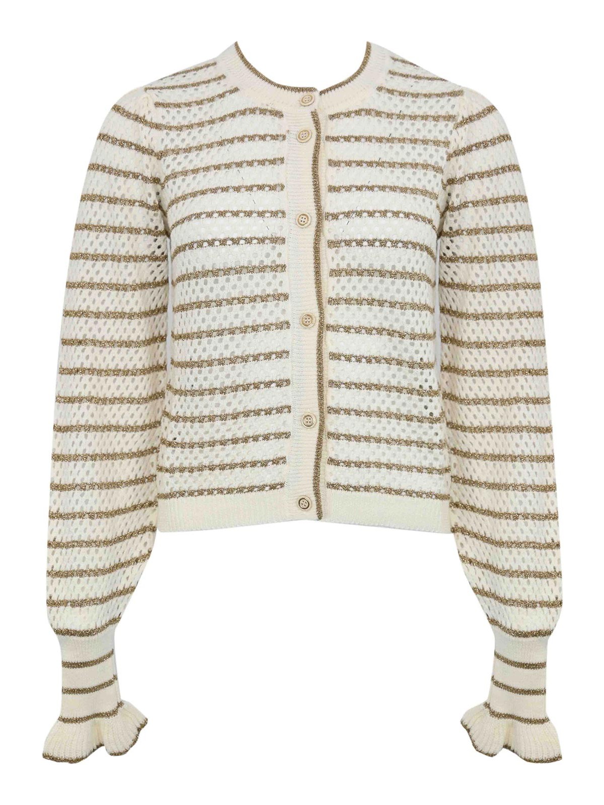 Maille perforée en coton et mélange, effet rayé horizontal, manches longues, poignets volantés, col rond, boutonné, coupe décontractée