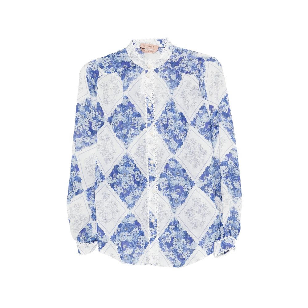 blue topaz floral print ruffle trim button fastening long sleeves collared