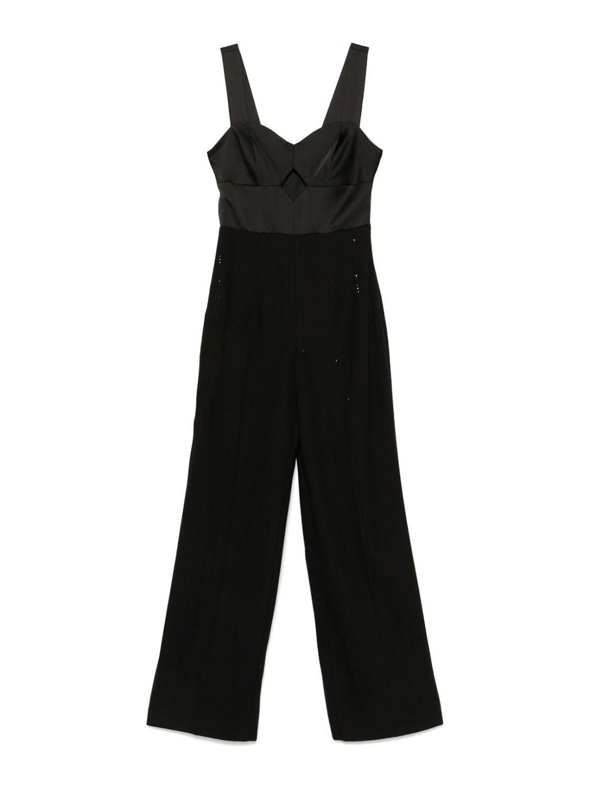 Finition noire, texture crêpe, motif à fines rayures, motif à fines rayures dissimulées, crochet latéral et fermeture éclair, col en caur, coupe moulée sans manches, coupe moulée, détails extérieurs, logo en T ovale à l'arrière, jambe droite