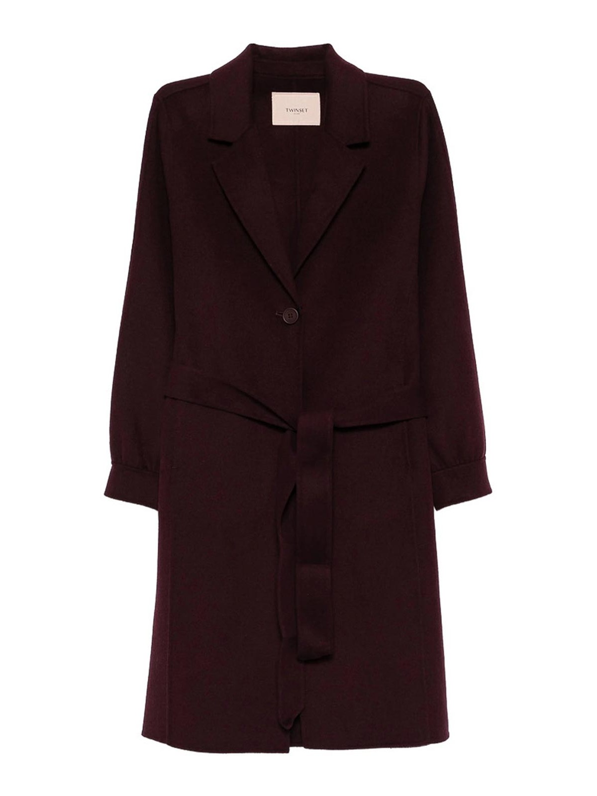 Ceinture bordeaux à boutonnage simple à nouer, manches longues, revers cranté, ourlet droit