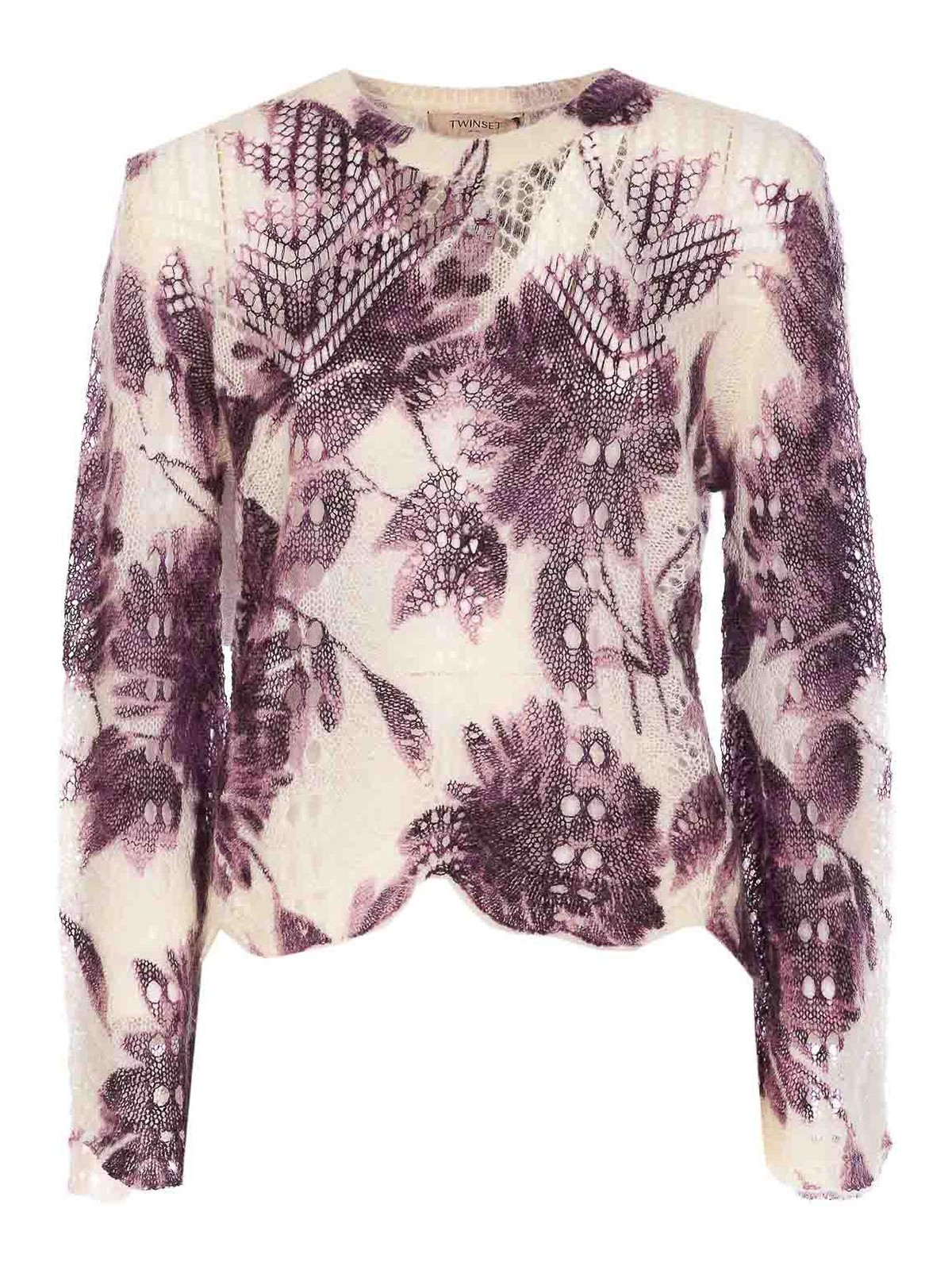 Pull Twinset blanc et violet à col rond à motif floral tricoté et effet transparent avec logo au dos