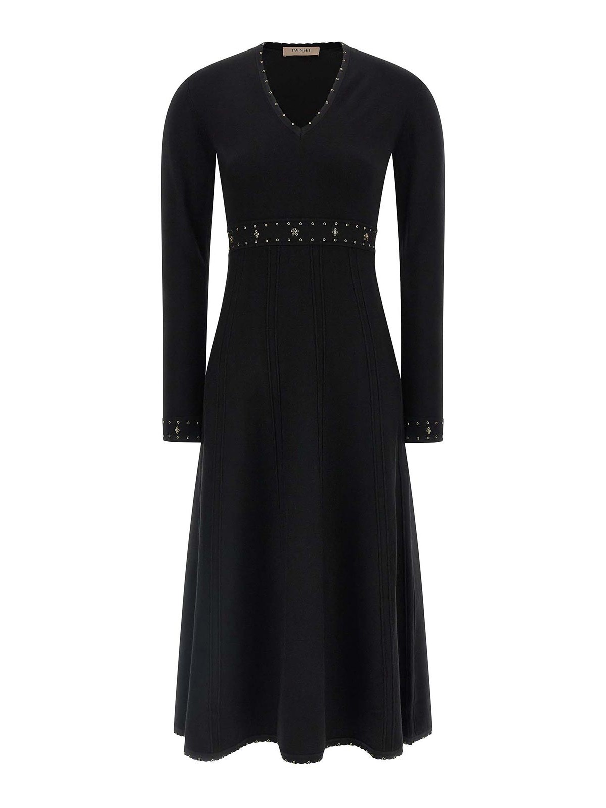 Robe midi stretch à motif rasé alternant avec des appliques côtelées et cloutées, col, manches longues, silhouette évasée avec jupe évasée, plaque logo « ovale » au dos non doublée