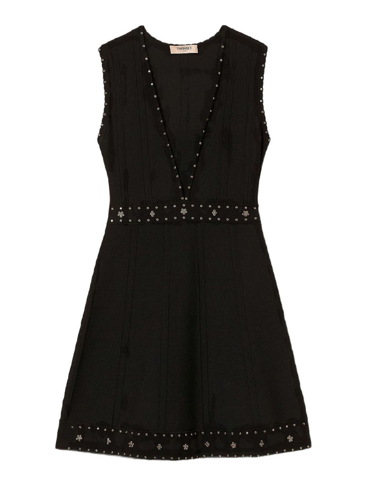 Black without sleeve decorations with synthetic diamonds plaque with logo on the back