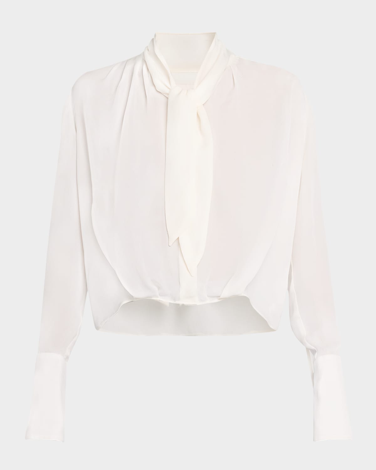 TWP "Bergman" semisheer silk blouse Approx. 20.8"L from shoulder to hem Collared neckline with a selftie scarf Dropped shoulders Long sleeves; button cuffs Yoked back Hip length Relaxed fit Concealed button front Silk Dry clean Imported