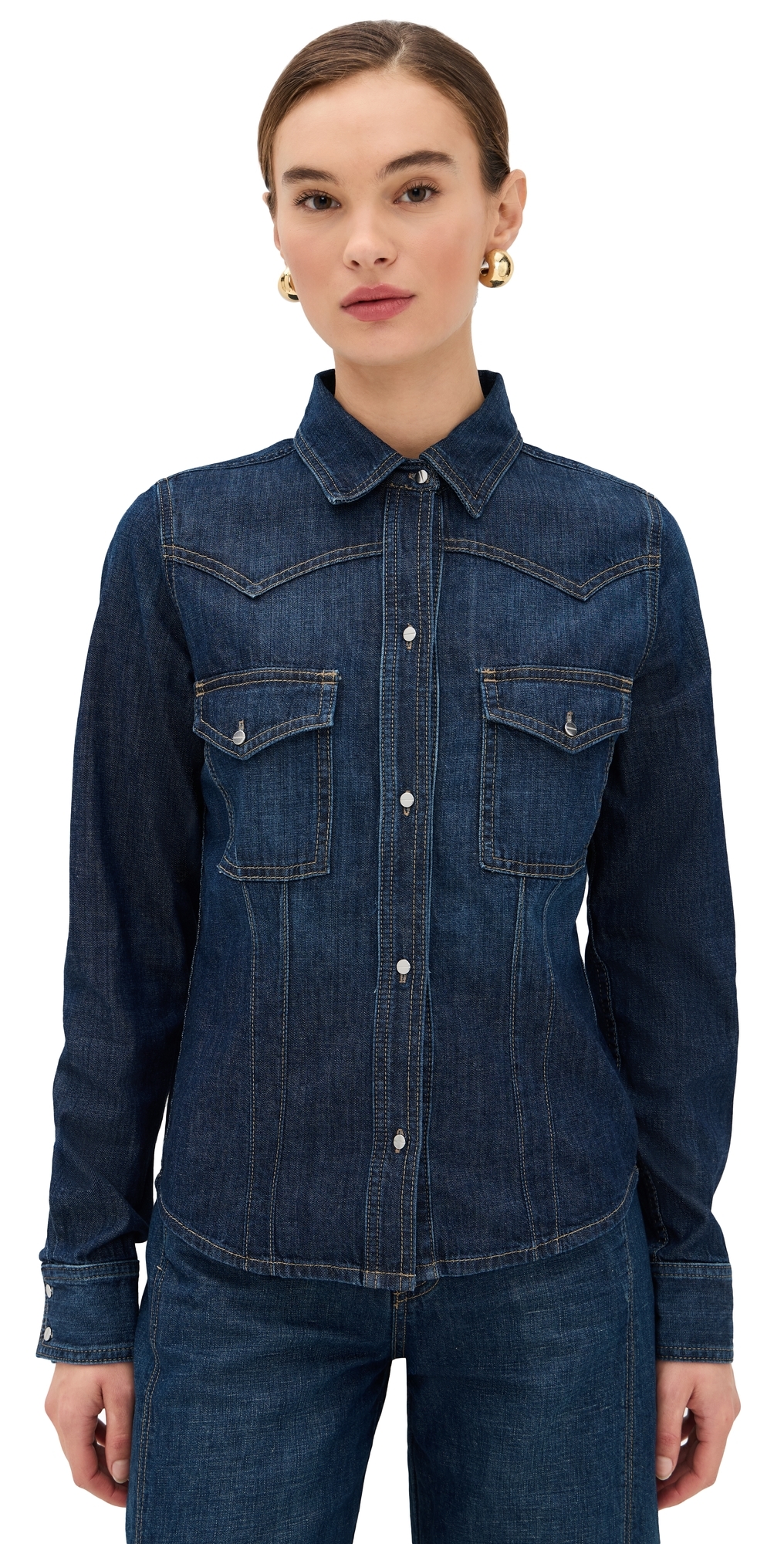 Fabric: Lightweight, non-stretch denim. Pointed western-style yokes. Bustier-style seams. Contrast stitching. Collared neck. Long sleeves with button cuffs. Button placket. Flap breast pockets with button closures. Shell: 100% cotton. Wash cold. Made in the USA. Measurements: Measurements from size XS Length: 24in / 61.0cm, from shoulder