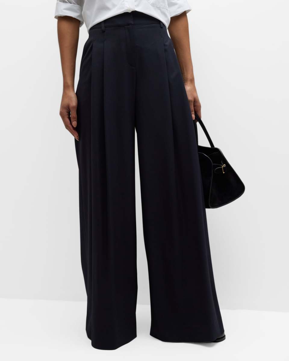 TWP "New Didi" classic Italian wool twill trousers boast a pleated front Mid rise Side seam pockets; back welt pocket Wide legs Full length Concealed hook/zip front; belt loops Wool/elastane Dry clean Made in USA from imported materials