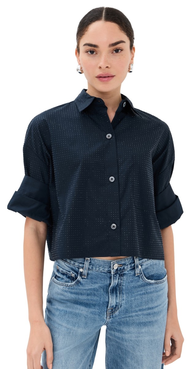 Fabric: Lightweight, non-stretch shirting. Allover crystal embellishments. Collared neck. Long sleeves with button cuffs. Button placket. Patch breast pocket. Shell: 100% cotton. Spot clean. Made in the USA. Measurements: Measurements from size XS/S Length: 19.75in / 50.0cm, from shoulder
