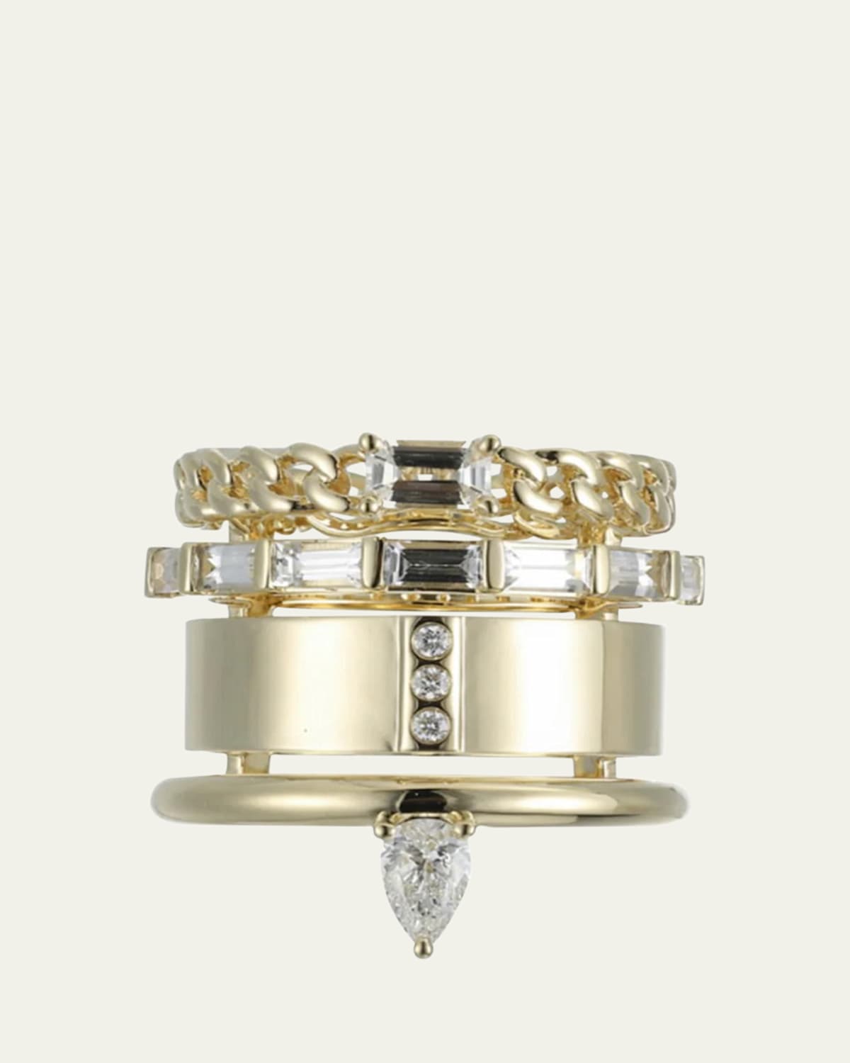TYPE JEWELRY introduces a lovely combination of brilliant diamonds and white sapphires for this Type Stack ring. Each layer of this ring is defined with texture and mixedcut stones. Polished 14karat yellow gold Round and pearshaped diamonds 0.33 total diamond carat weight Baguette and emeraldcut white sapphires 1.42 total sapphire carat weight Imported