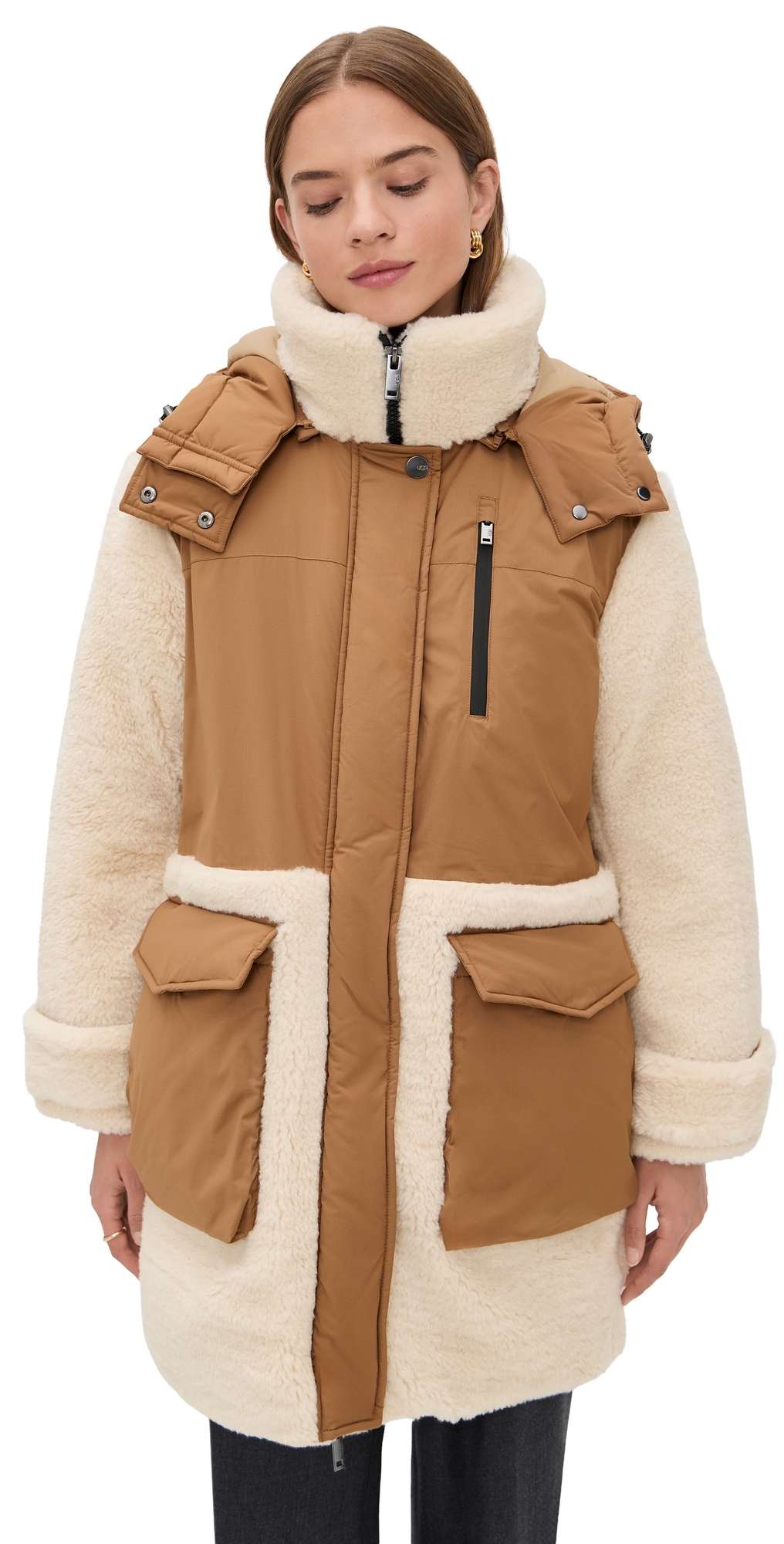 Cannot be shipped outside the USA Fabric: Heavyweight, non-stretch ripstop. Water resistant design. Fleece trim and front panels. Rubber logo patch at sleeve. Single back vent with zip closure. Hooded neckline. Long sleeves with snap cuffs. Snap flap and hidden zip placket. Flap and zip front pockets. Shell: 100% polyester. Trim: 100% polyester. Lined. Lining: 100% nylon. Fill: 90% down/10% feathers. Wash cold. Imported, China. Measurements: Measurements from size XS Length: 32.75in / 83.0cm, from shoulder