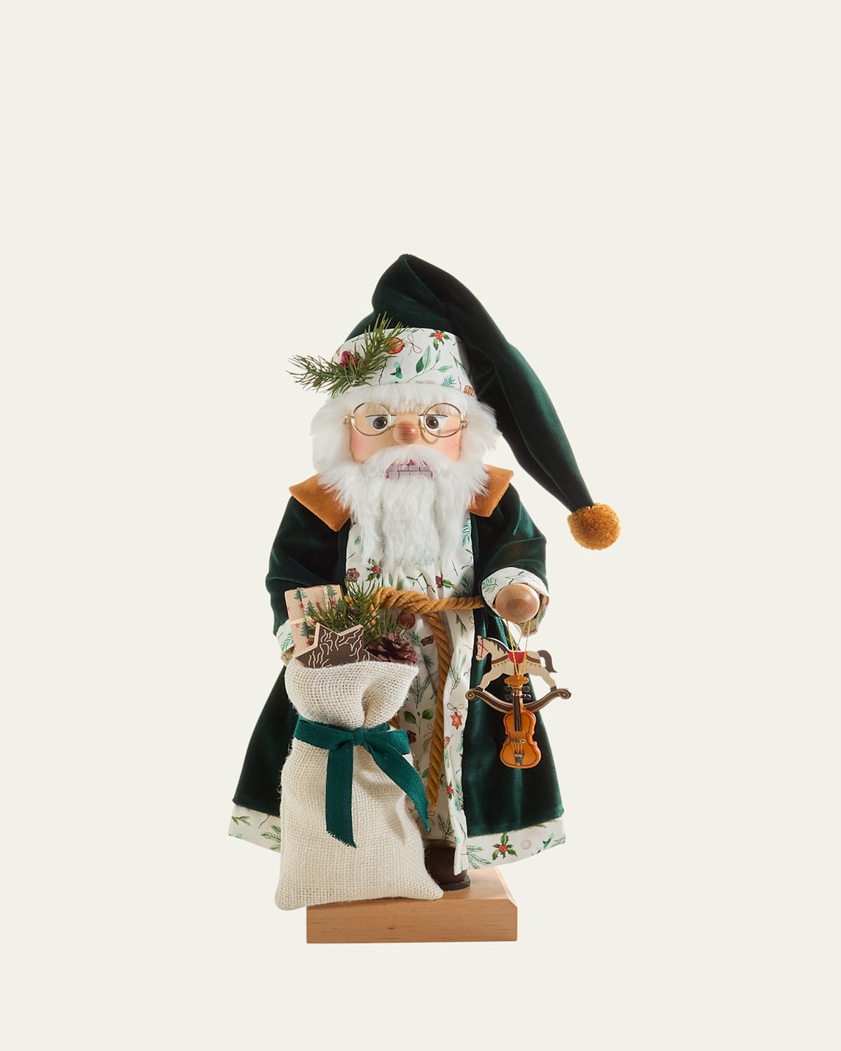 This premium nutcracker proves that Santa doesn't always have to wear red. Sporting a green velvet coat accented with a trim featuring a wintery motif, he holds a rocking horse and violin in hand, ready to be delivered to the children with the rest of the presents. Handcrafted of wood, polyester, and faux fur (polyester) Approx. 7.1"L x 8.5"W x 19.3"T Item Weight (Lbs.): 3.2 Dust with a soft cloth Made in Germany