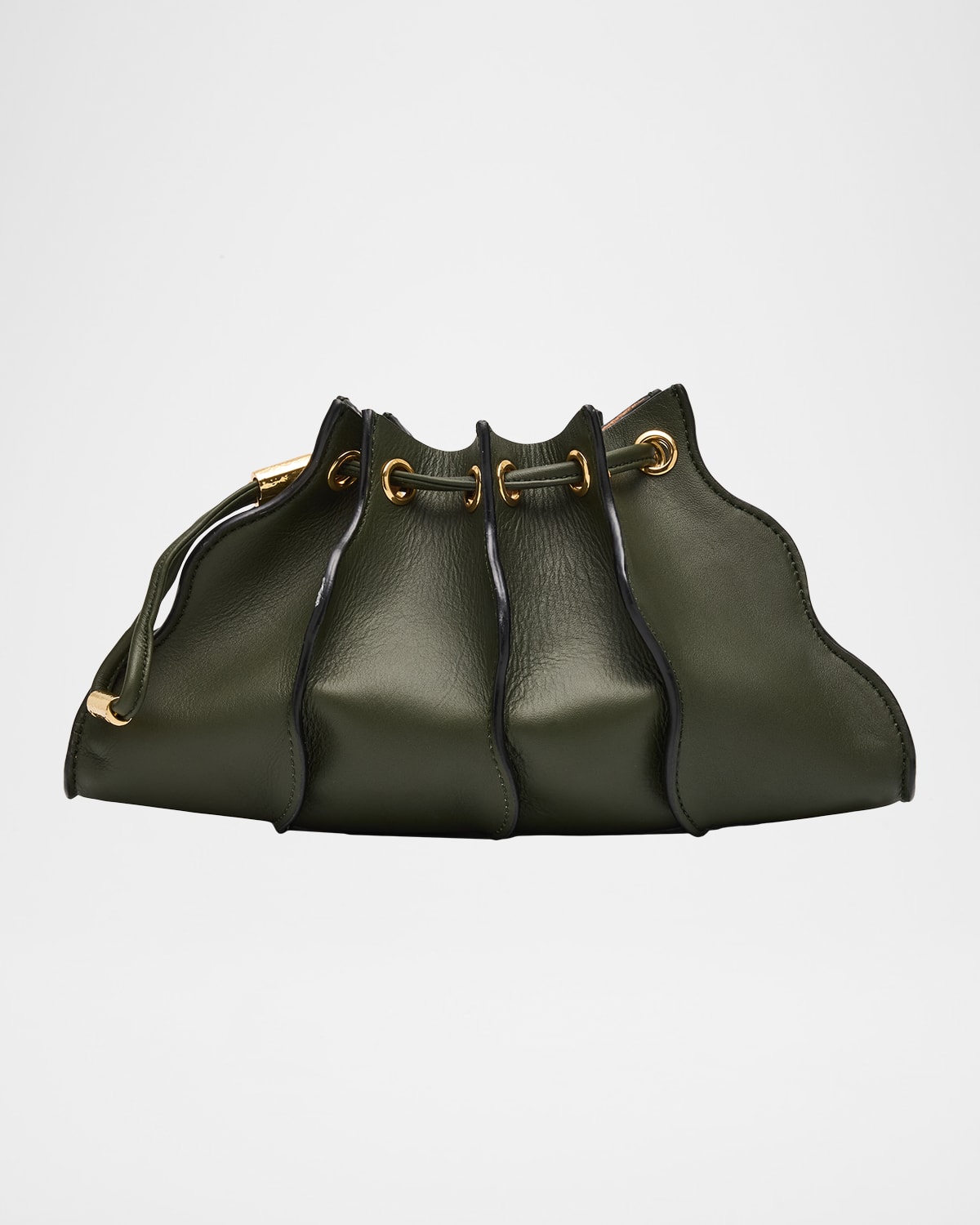 Crafted with sewntogether panels of leather, this Ulla Johnson "Adria" crossbody bag features a pleated, wavy silhouette finished with painted edges and hammered brass hardware Wristlet strap Detachable, adjustable crossbody strap, 21.7" drop Can be worn as a wristlet or crossbody bag Drawstring closure Lining: Suede Approx. 4"H x 6.1"W x 2.8"D Made in Italy