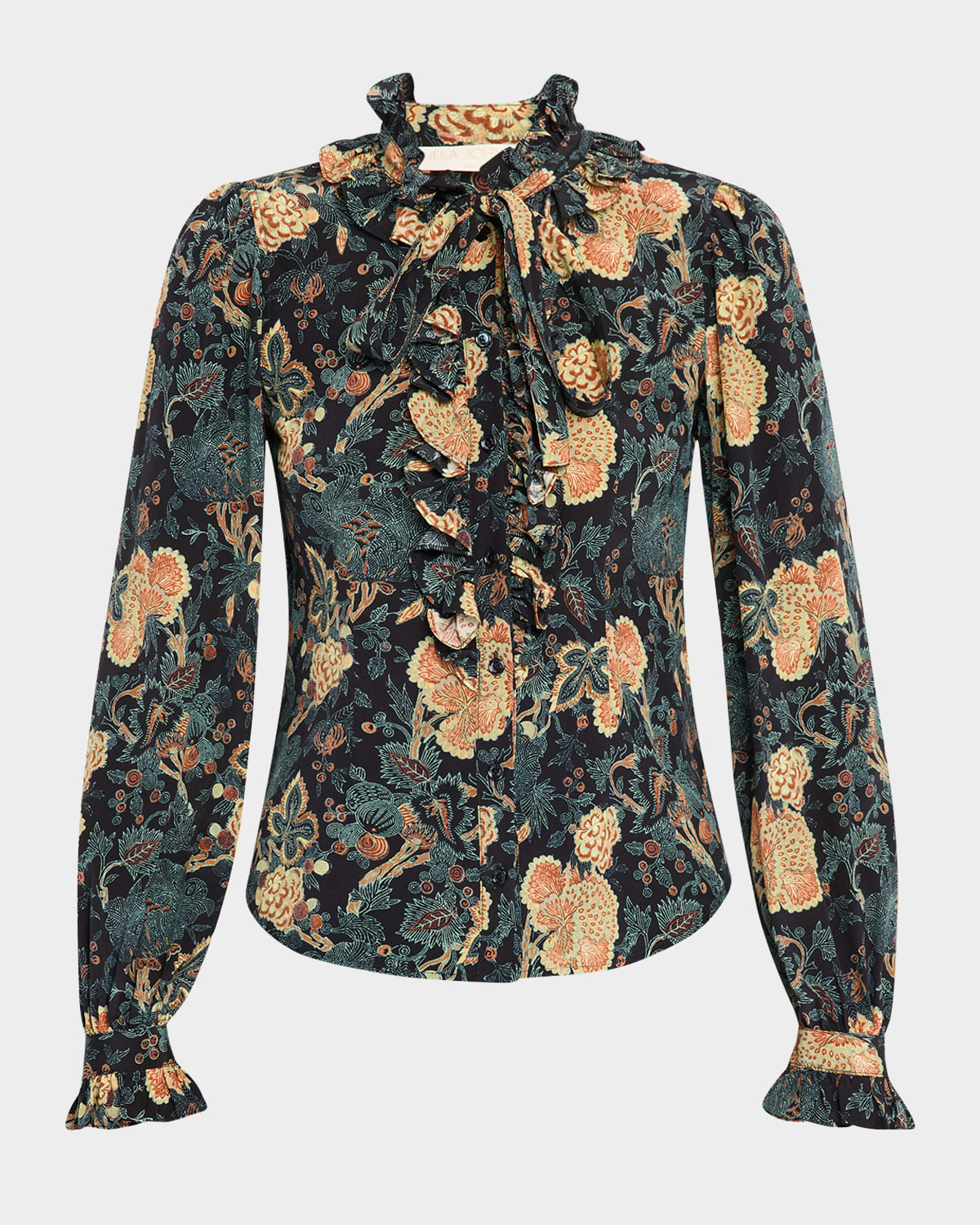 Ulla Johnson "Catroux" luxurious silk top in an intricate paisleyprint Ruffled collar with selftie Long sleeves with button cuffs Classic fit Hem falls to the hip Buttonfront Silk Dry clean Imported