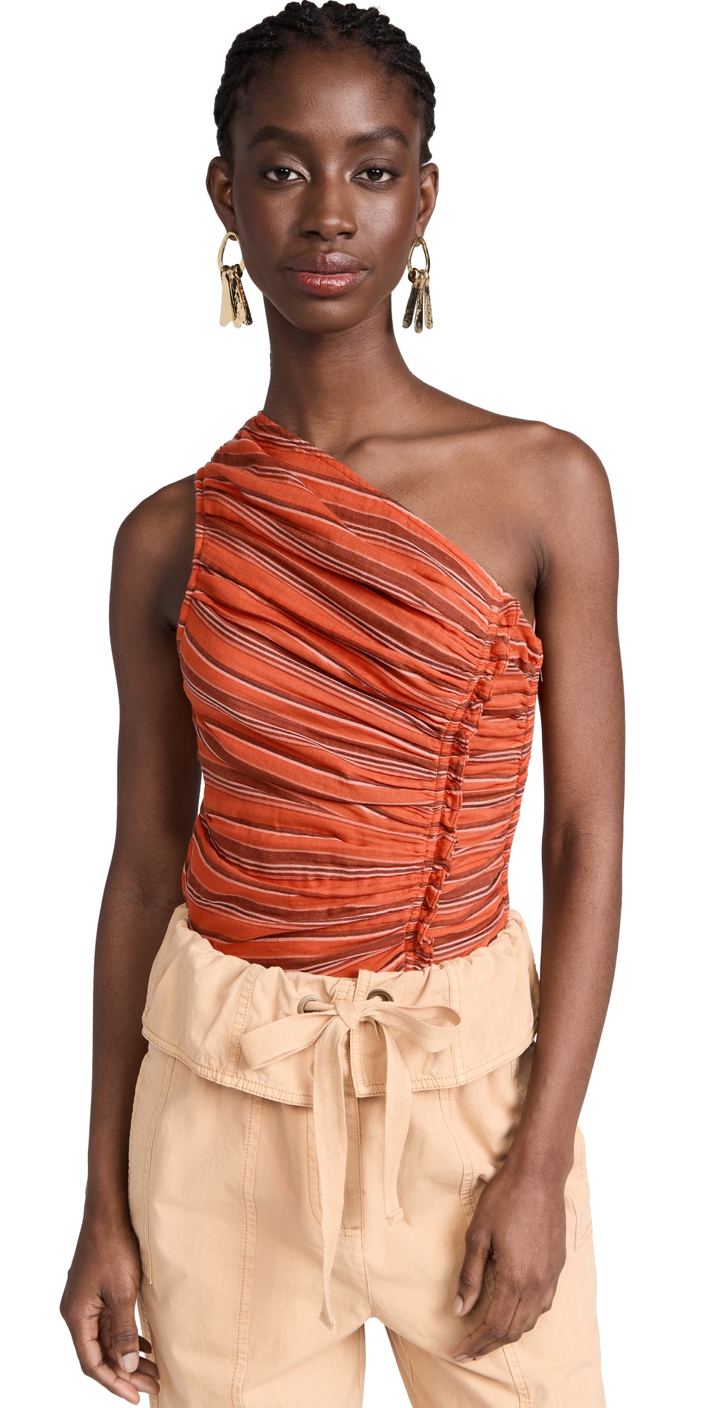 Fabric: Lightweight, non-stretch weave. Ruched design and ruffle trim. One-shoulder neckline. Stripe pattern. Hidden zip at side. Shell: 100% cotton. Hand wash. Imported, India. Measurements: Measurements from size 0 Length: 22.5in / 57.0cm, from shoulder